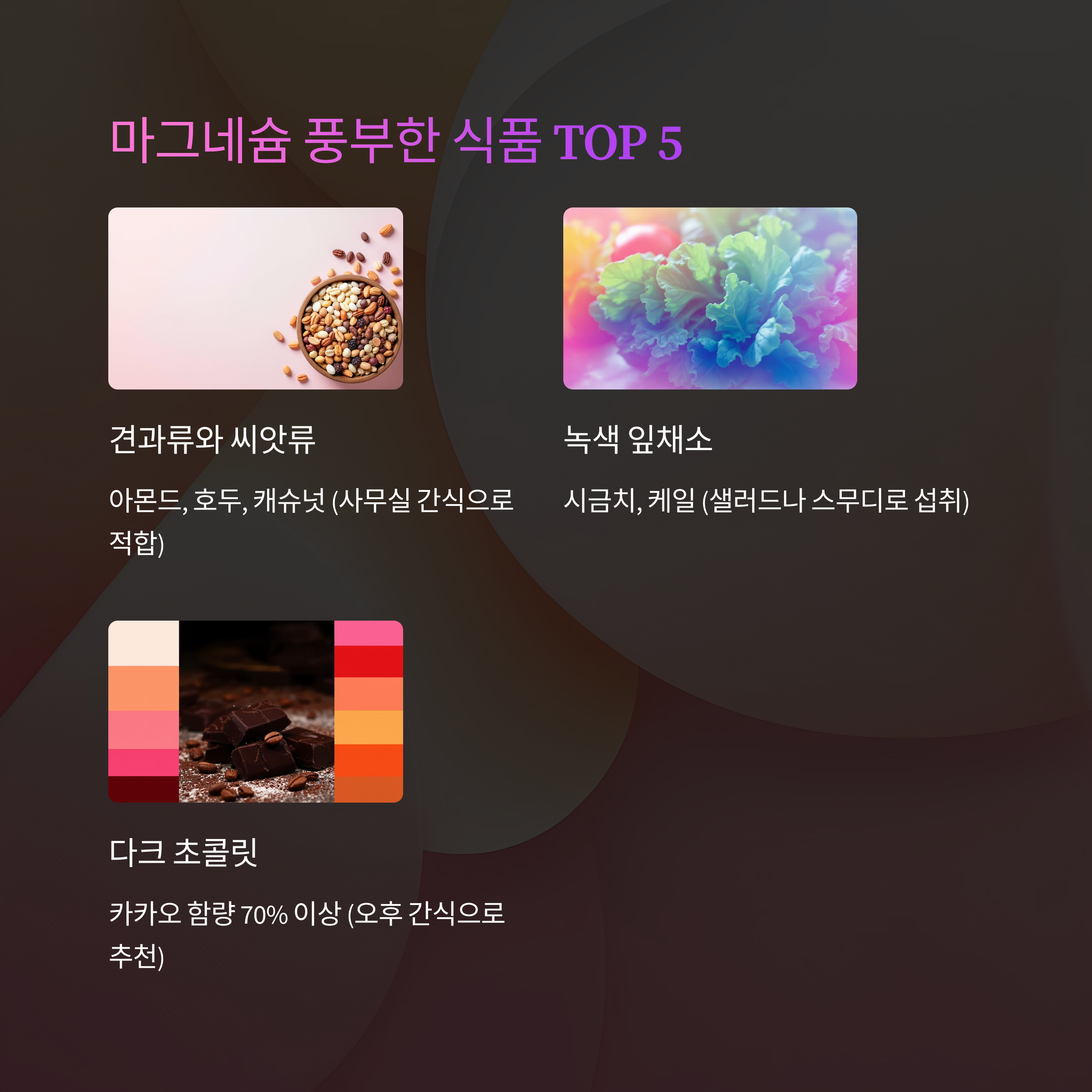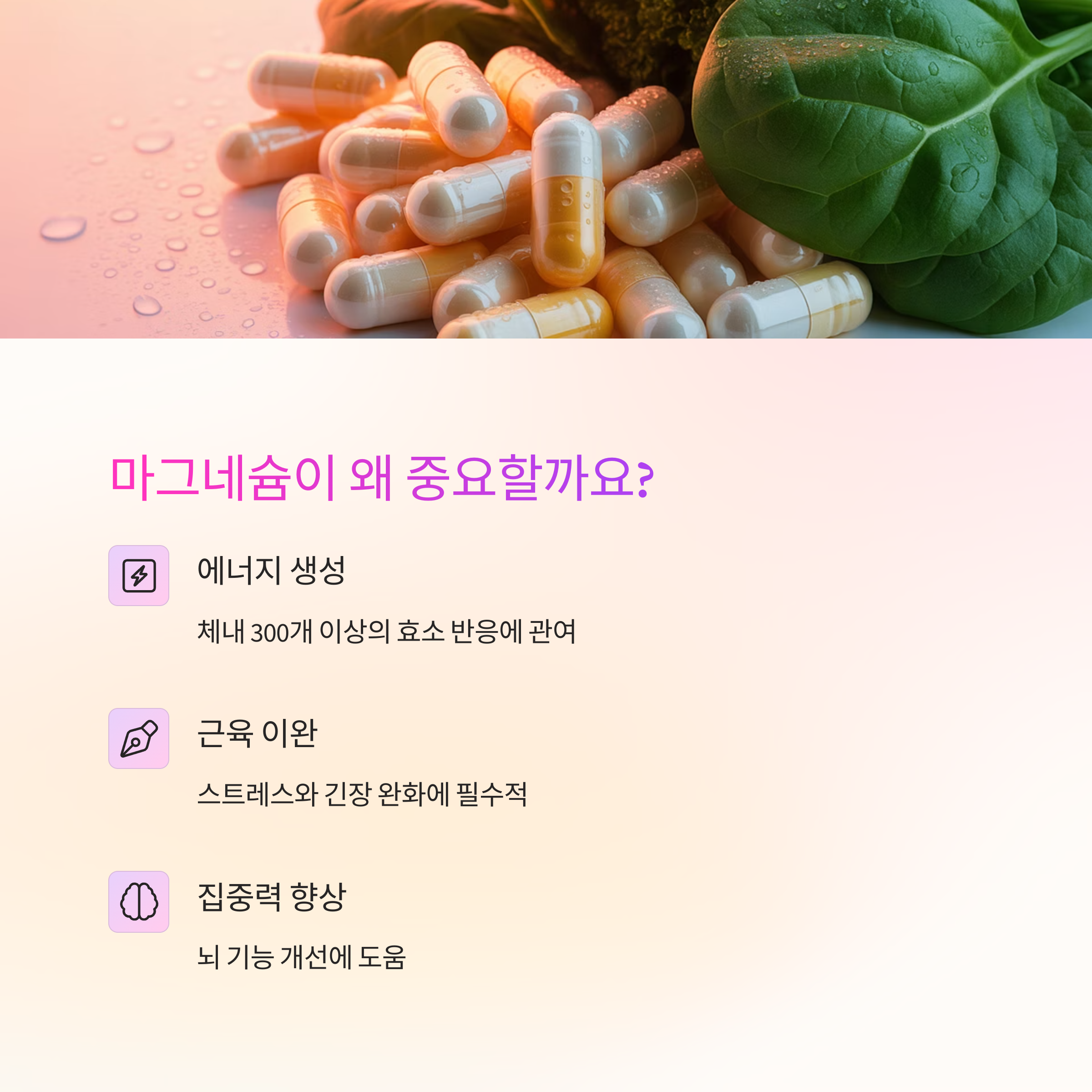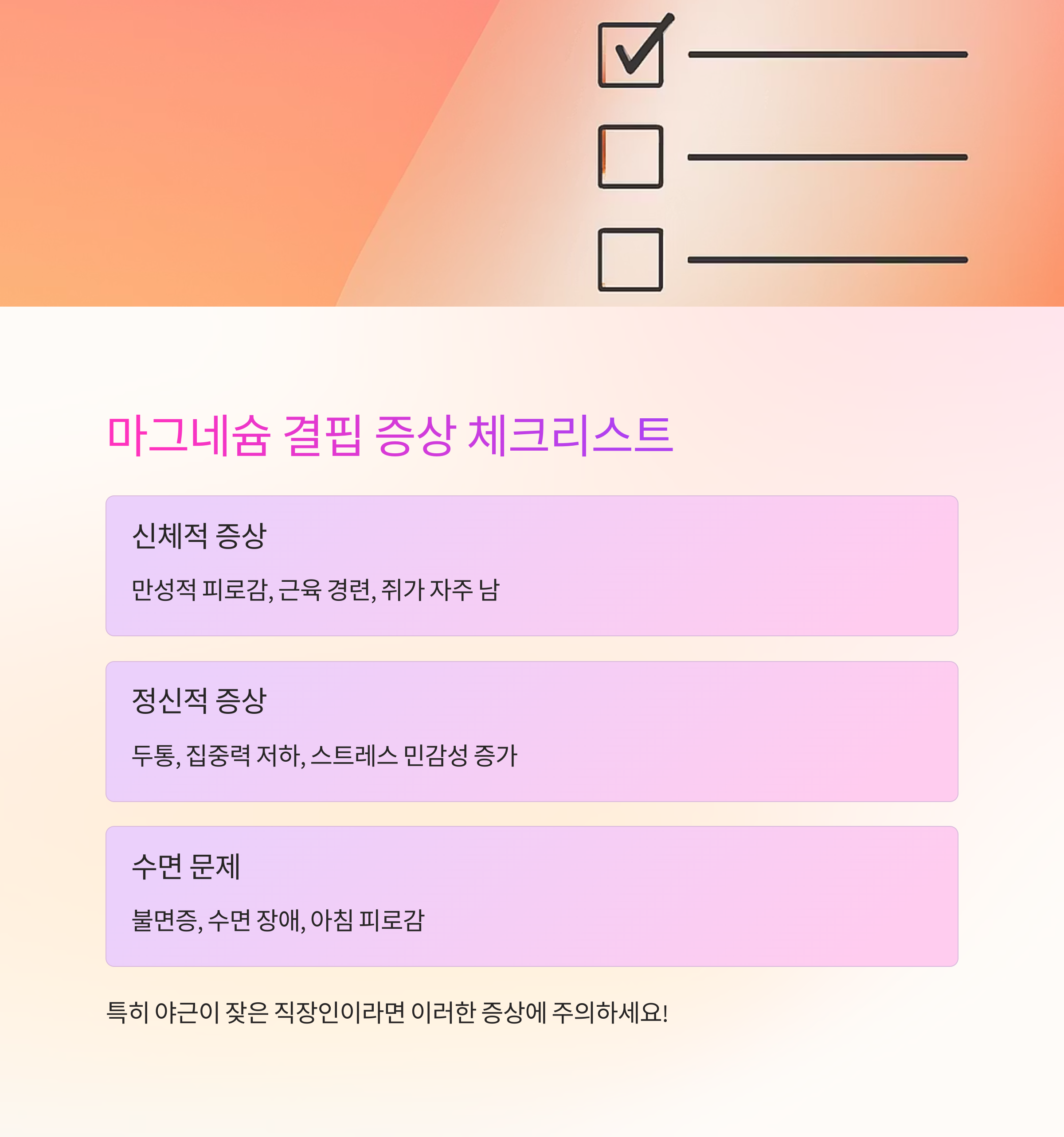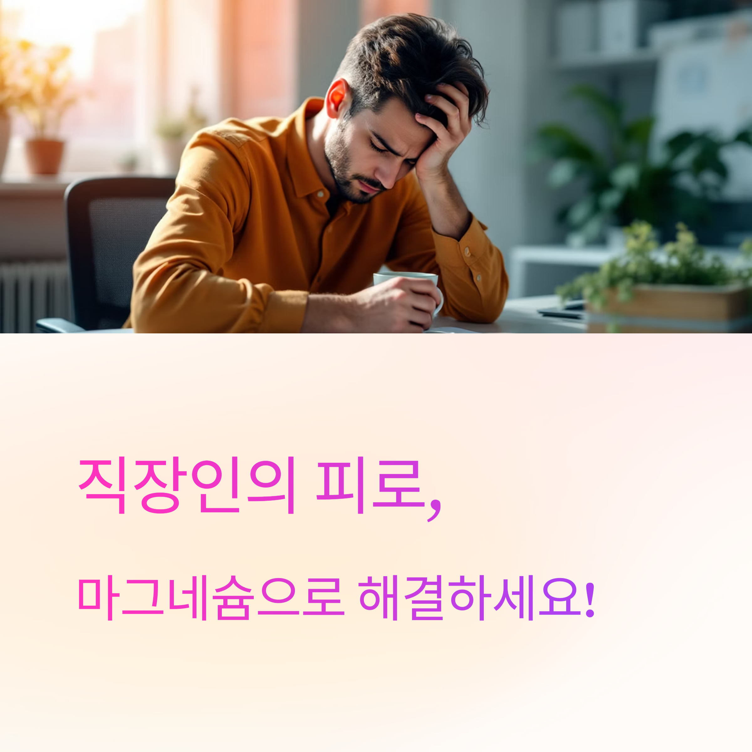 특히 야근이 잦거나 높은 스트레스 환경에서 일하는 직장인이라면, 이러한 증상들이 마그네슘 결핍과 연관되어 있을 가능성이 높습니다.
