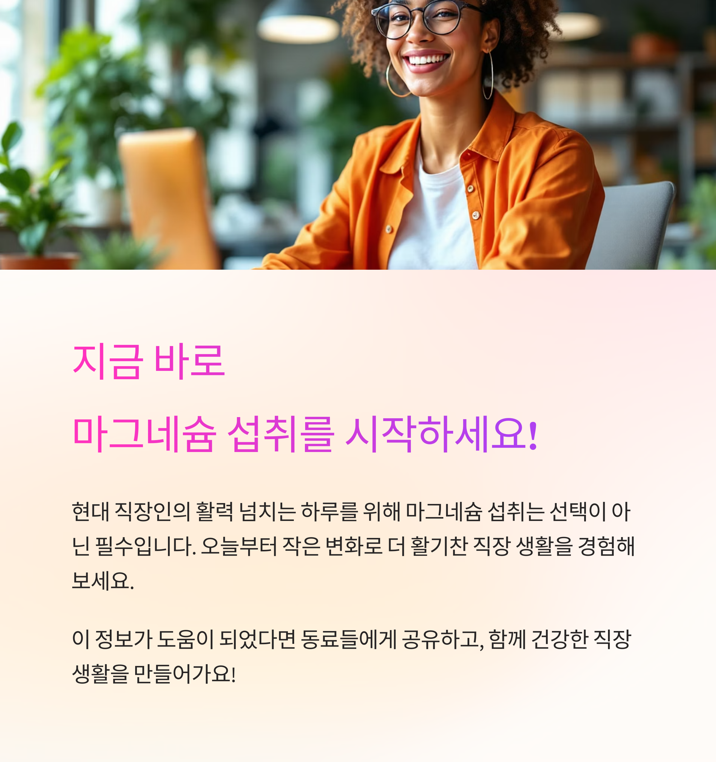 현대 직장인의 활력 넘치는 하루를 위해 마그네슘 섭취는 선택이 아닌 필수입니다. 식단 관리와 필요시 적절한 보충제 활용으로 만성 피로를 이겨내고, 업무 효율성을 높이는 데 도움을 받을 수 있습니다. 지금부터 마그네슘 섭취에 관심을 두고 실천해보세요. 더 활기찬 직장 생활이 기다리고 있습니다.