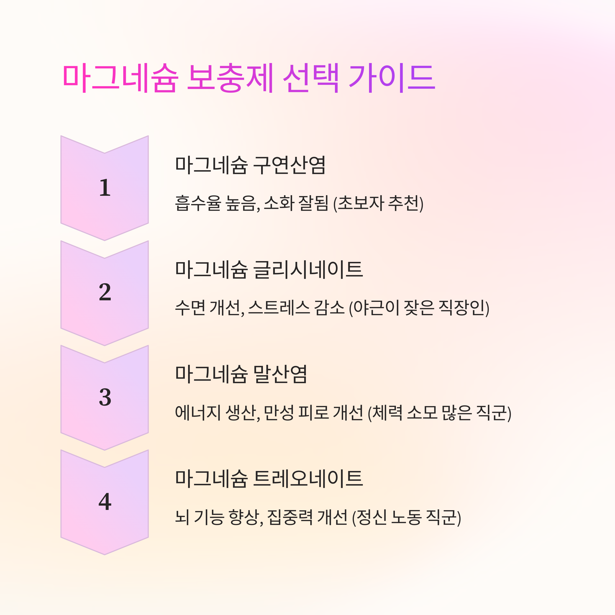 선택 시 흡수율과 본인의 증상에 맞는 제품을 고르는 것이 중요합니다. 특히 소화 문제가 있다면 마그네슘 구연산염이나 글리시네이트가 적합합니다.