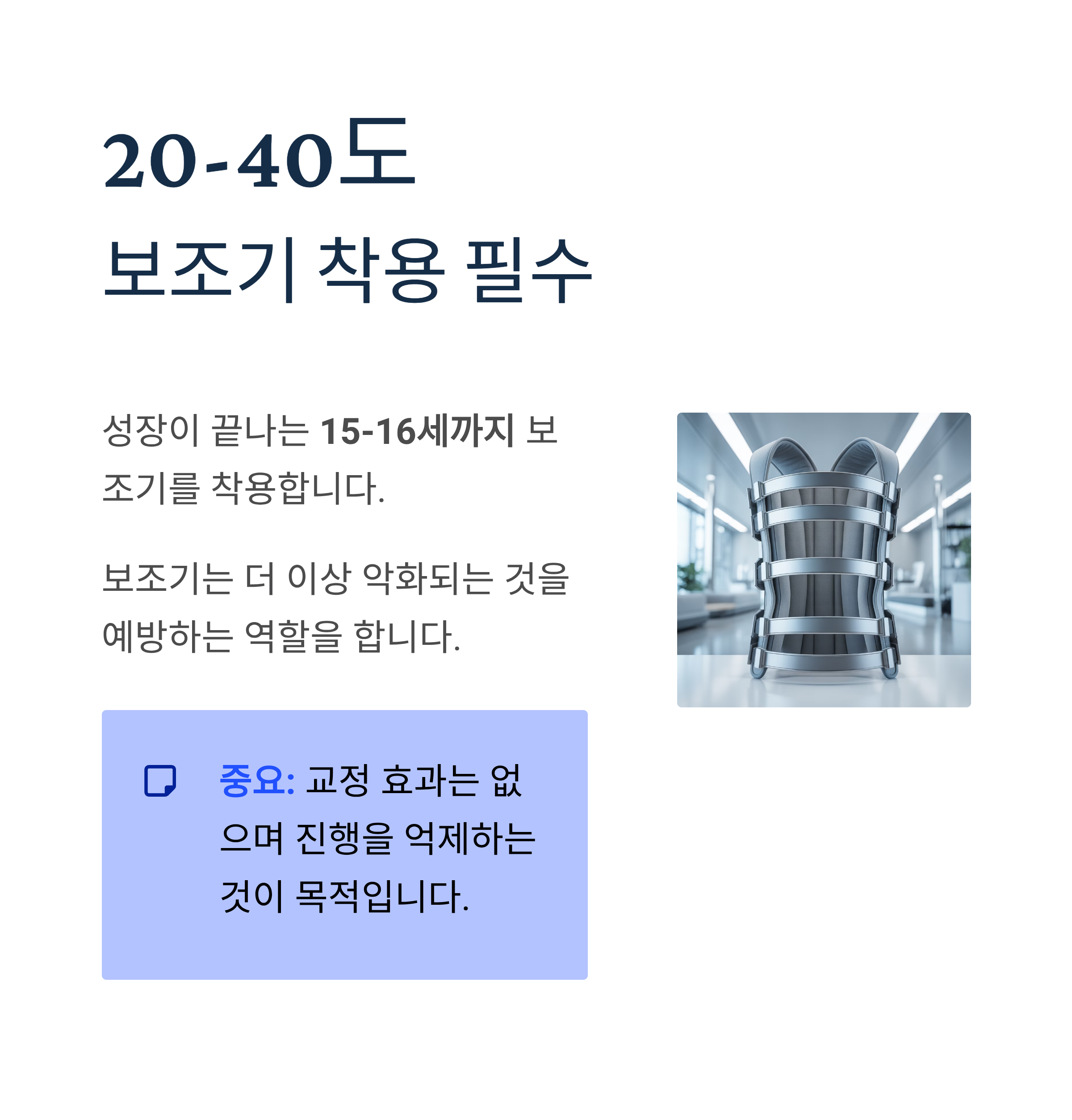 - 20도 이상이면 보조기 착용, 40도 이상이면 수술 고려
