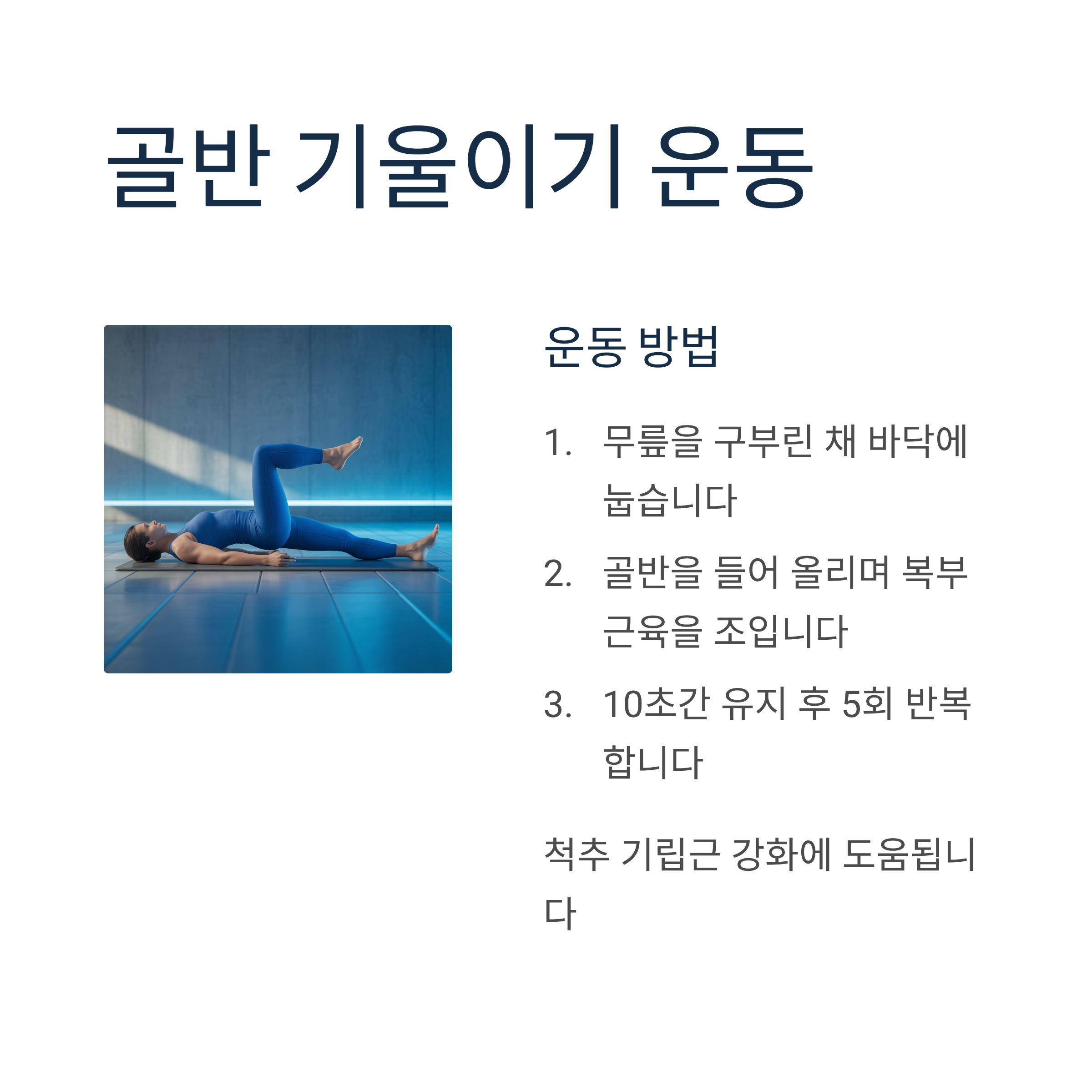 무릎을 구부린 채 바닥에 누워 골반을 들어 올리며 복부 근육을 조입니다. 10초간 유지 후 5회 반복하면 척추 기립근 강화에 도움됩니다.