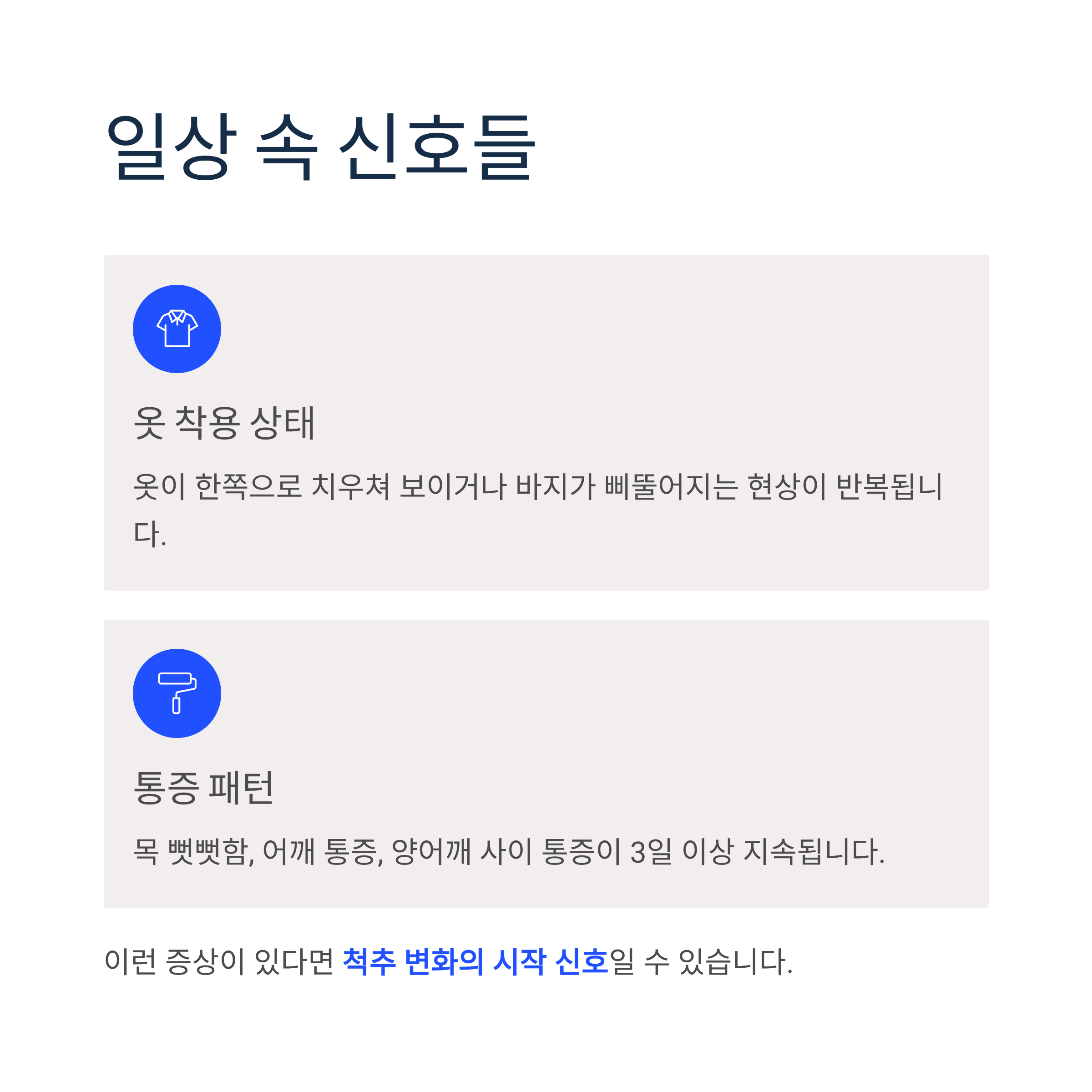 목 뻣뻣함, 어깨 통증, 양어깨 사이 통증이 3일 이상 지속되면 척추 변화의 시작 신호일 수 있습니다.