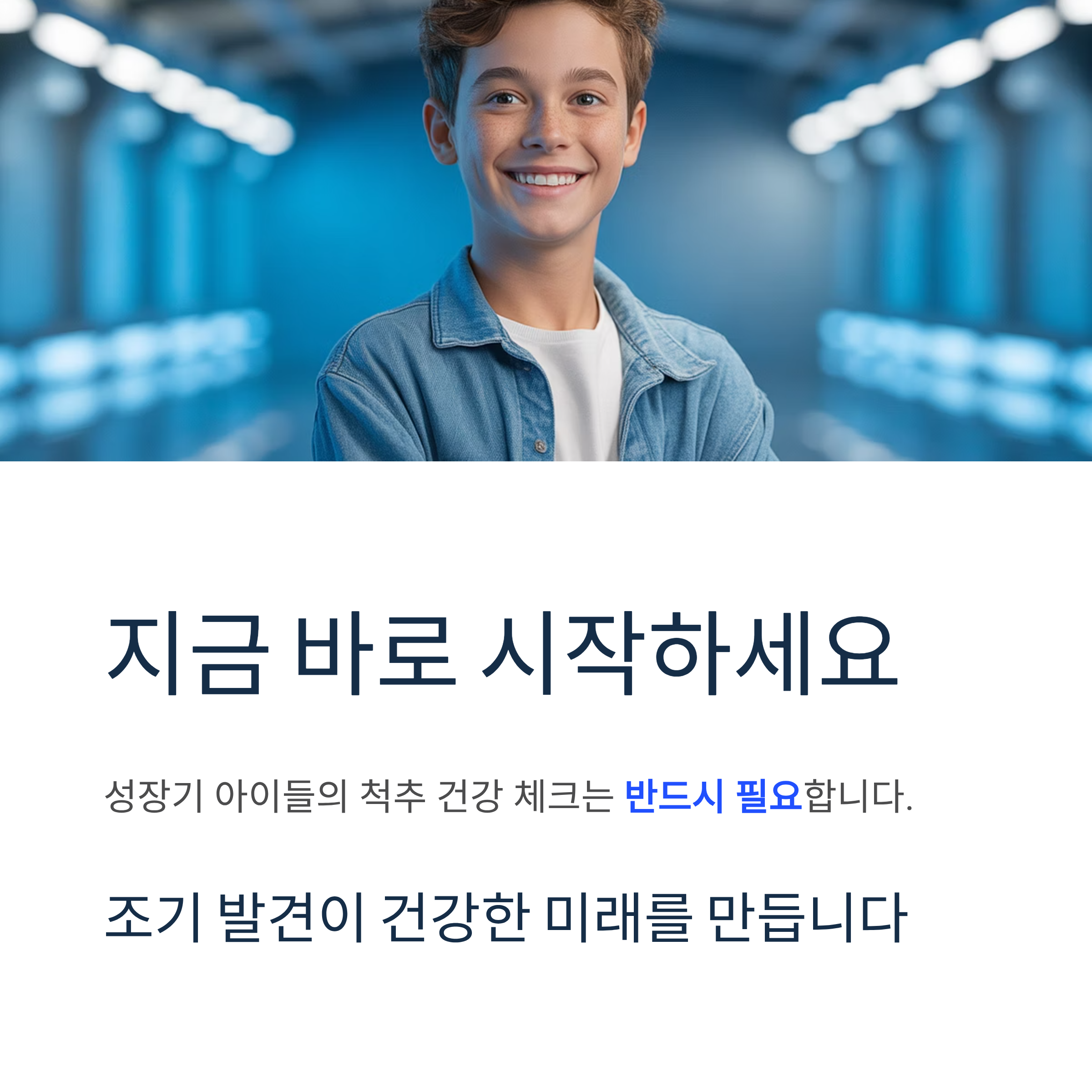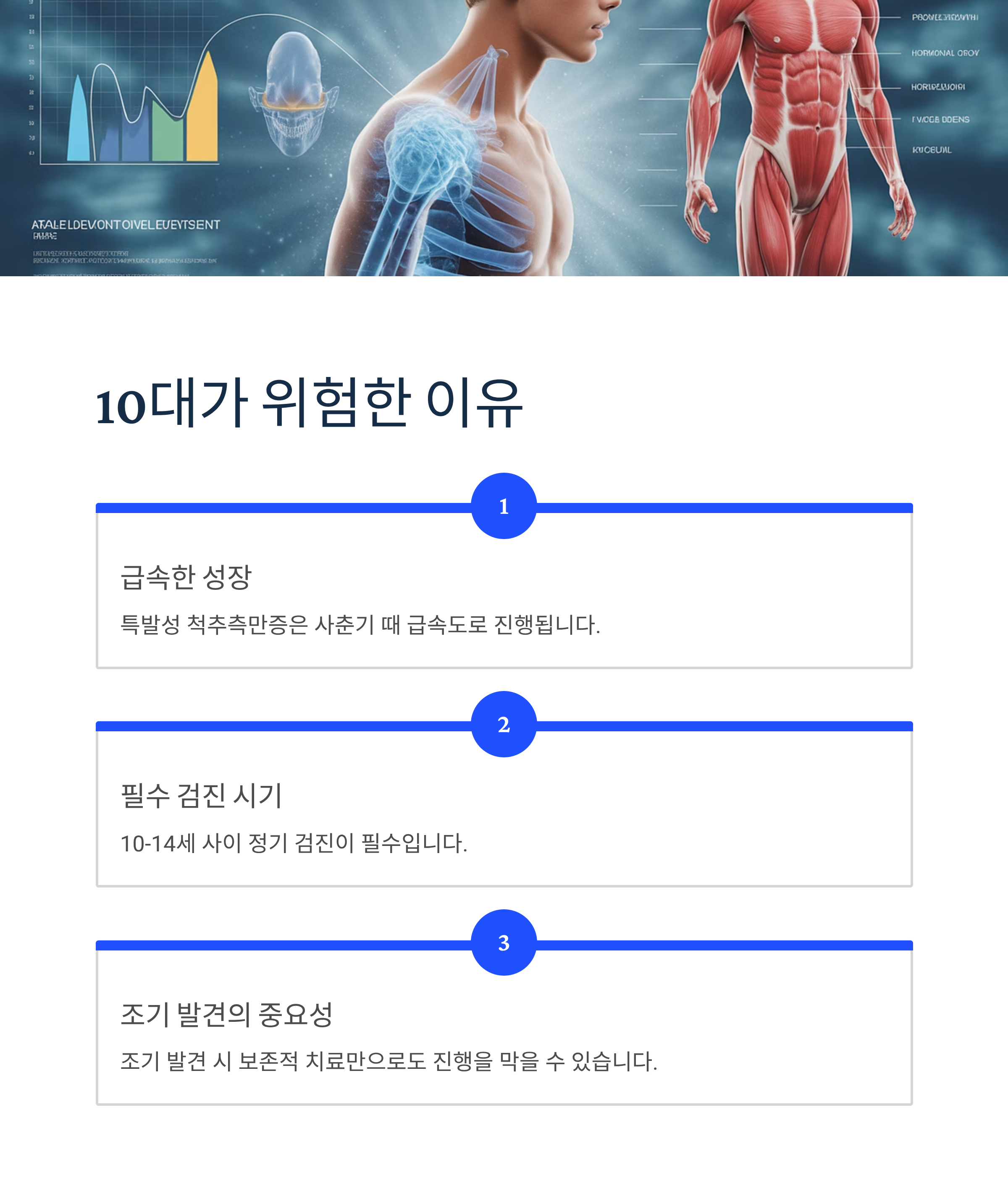 특발성 척추측만증은 사춘기 때 급속도로 진행되므로 10-14세 사이 정기 검진이 필수입니다. 조기 발견 시 보존적 치료만으로도 진행을 막을 수 있어 성장기 아이들의 척추 건강 체크는 반드시 필요합니다.