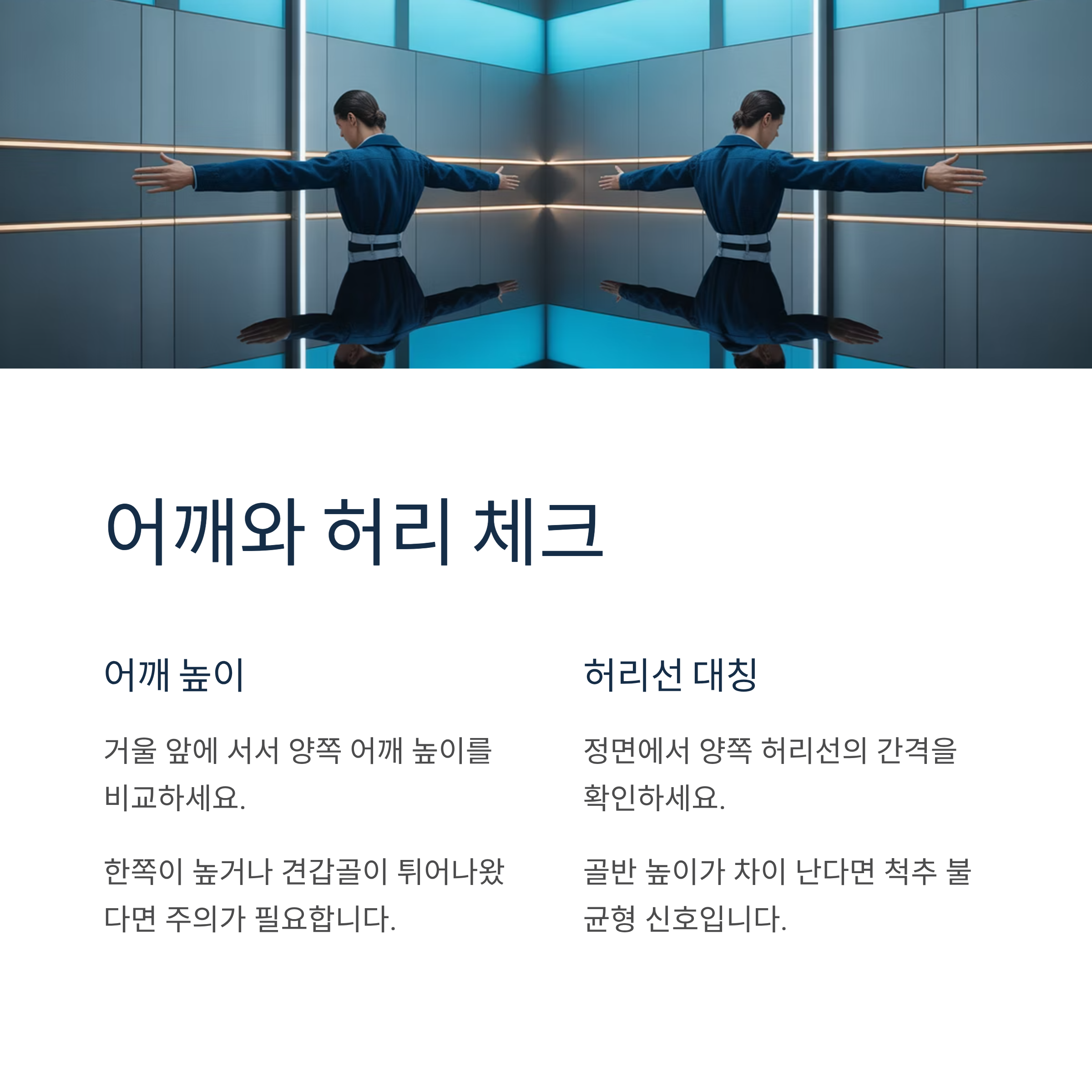 거울 앞에 서서 양쪽 어깨 높이를 확인합니다. 한쪽 어깨가 다른 쪽보다 높거나 견갑골이 튀어나와 있다면 주의가 필요합니다.