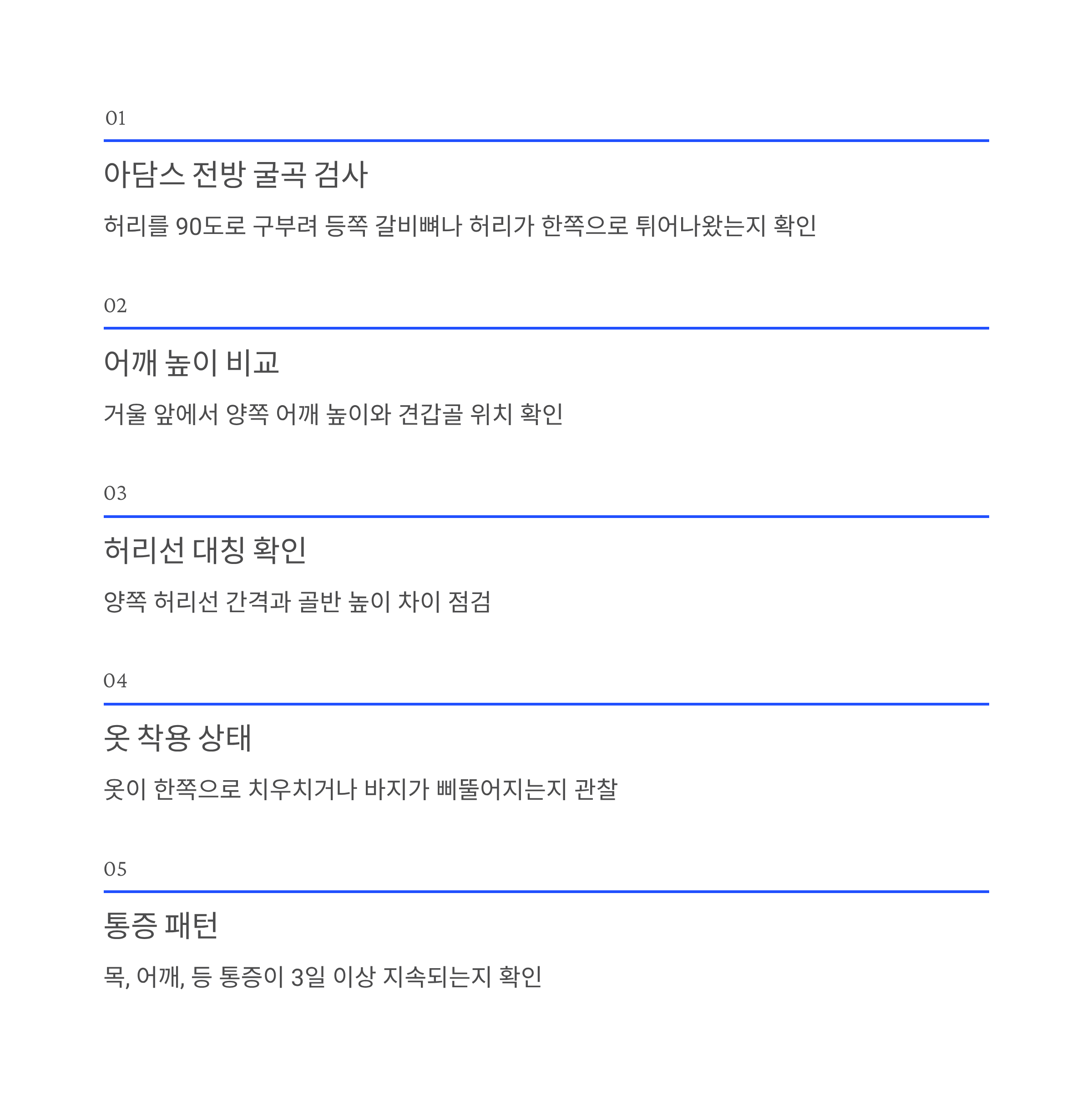 - 아담스 전방 굴곡 검사로 집에서 자가진단 가능