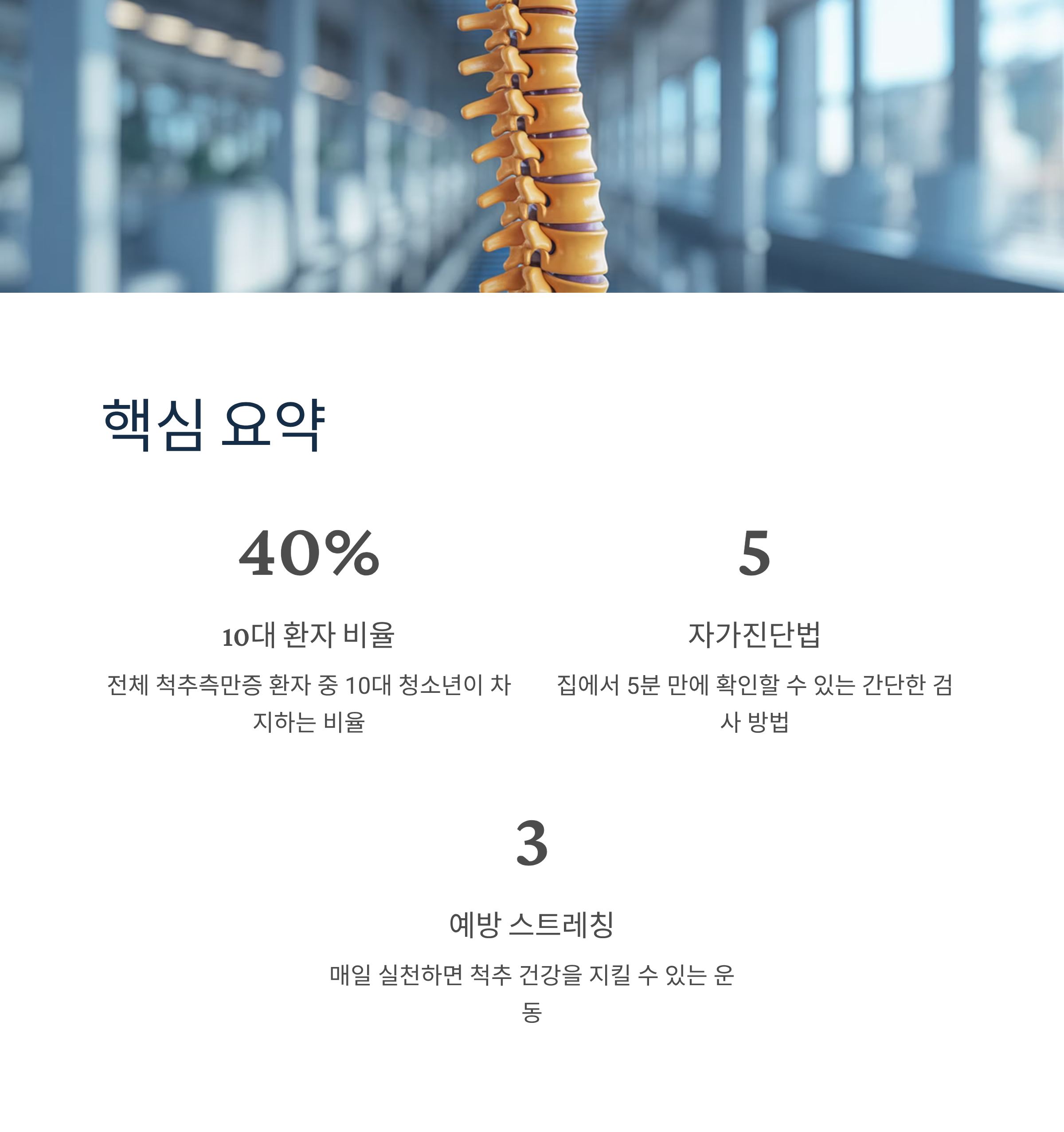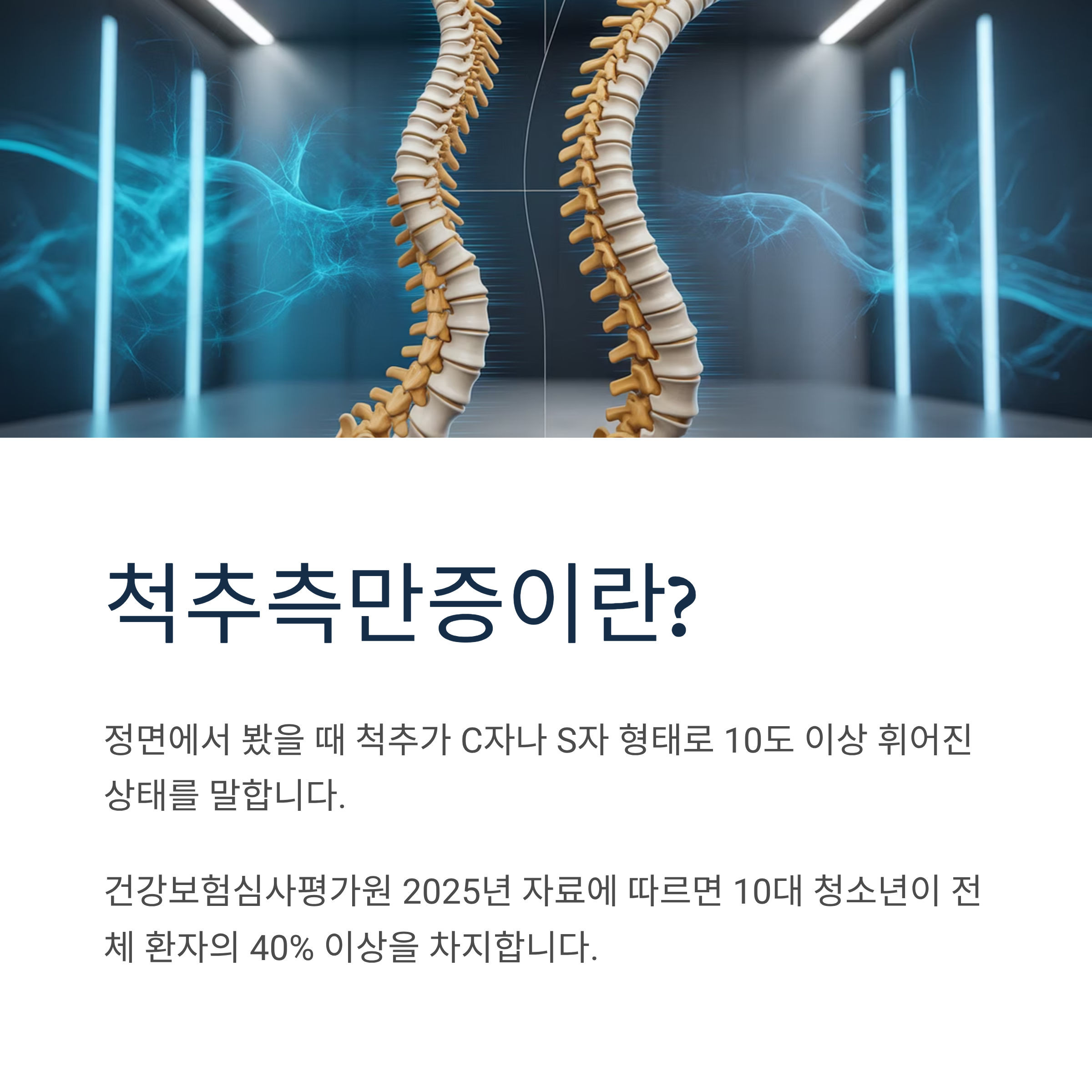 척추측만증은 정면에서 봤을 때 척추가 C자나 S자 형태로 10도 이상 휘어진 상태를 말합니다. 건강보험심사평가원 2025년 자료에 따르면 전체 척추측만증 환자 중 10대 청소년이 40% 이상으로 가장 높은 비율을 차지하고 있어 조기 발견이 무엇보다 중요합니다.