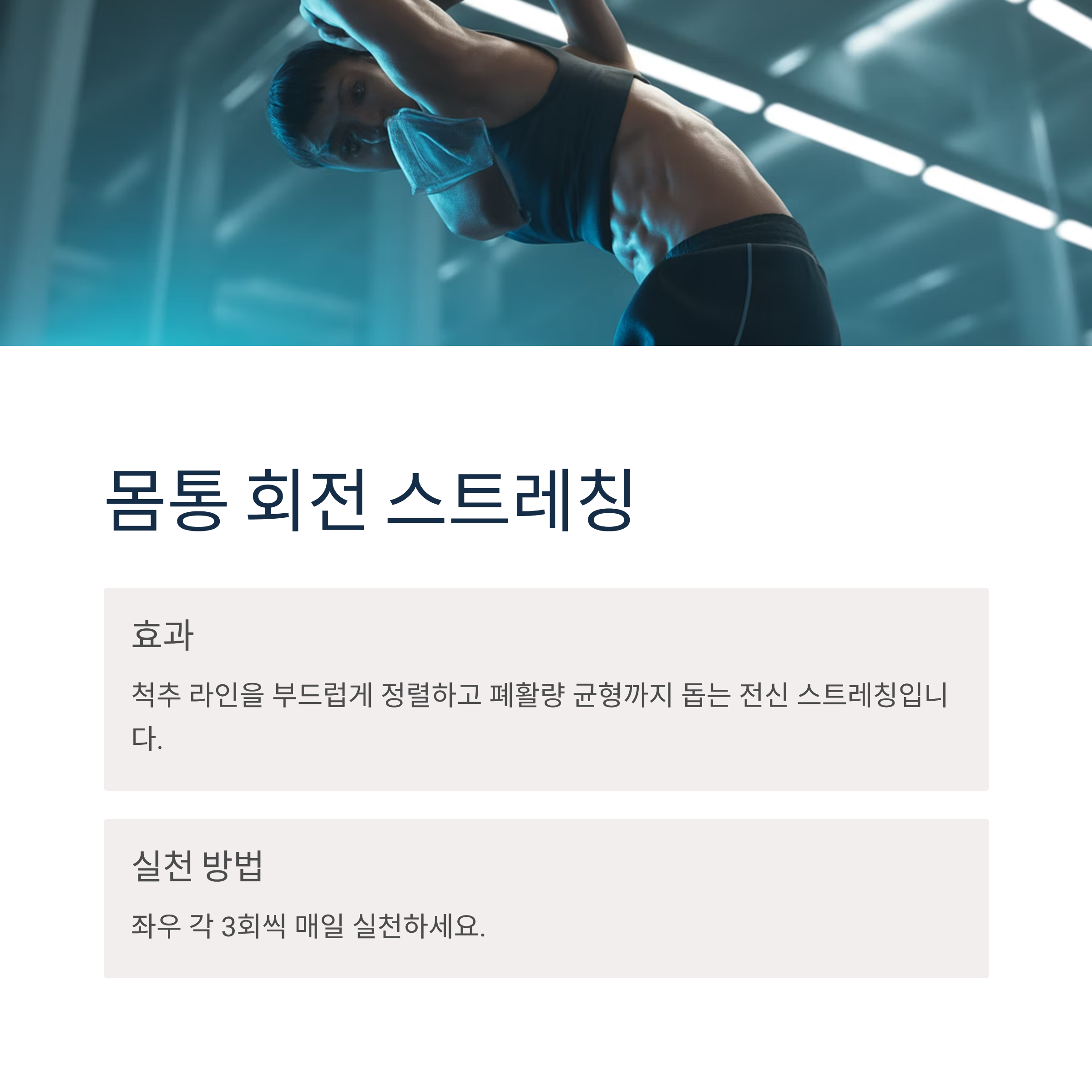척추 라인을 부드럽게 정렬하고 폐활량 균형까지 돕는 전신 스트레칭입니다. 좌우 각 3회씩 매일 실천하세요.