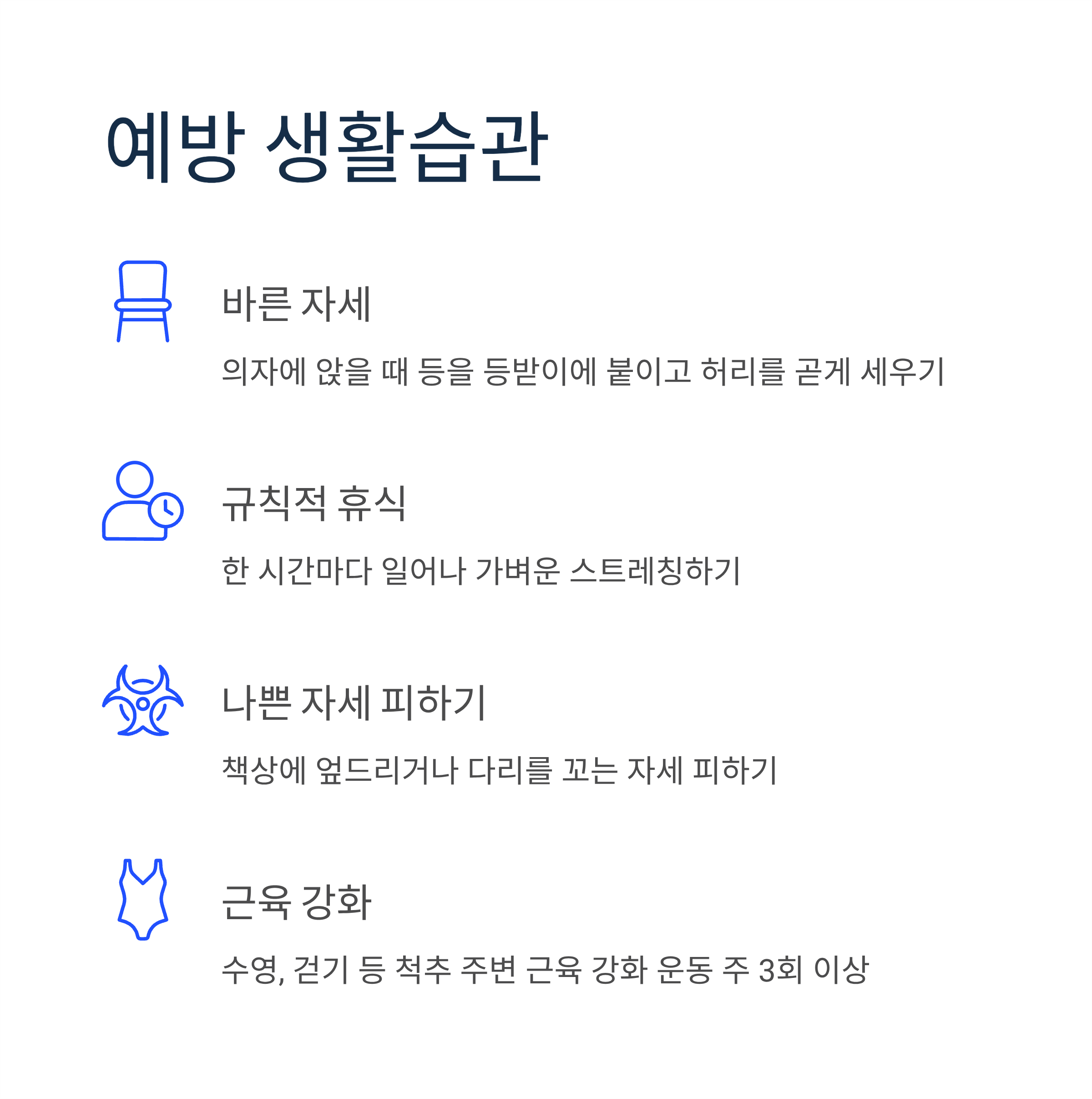 - 수영, 걷기 등 척추 주변 근육 강화 운동 주 3회 이상 실시