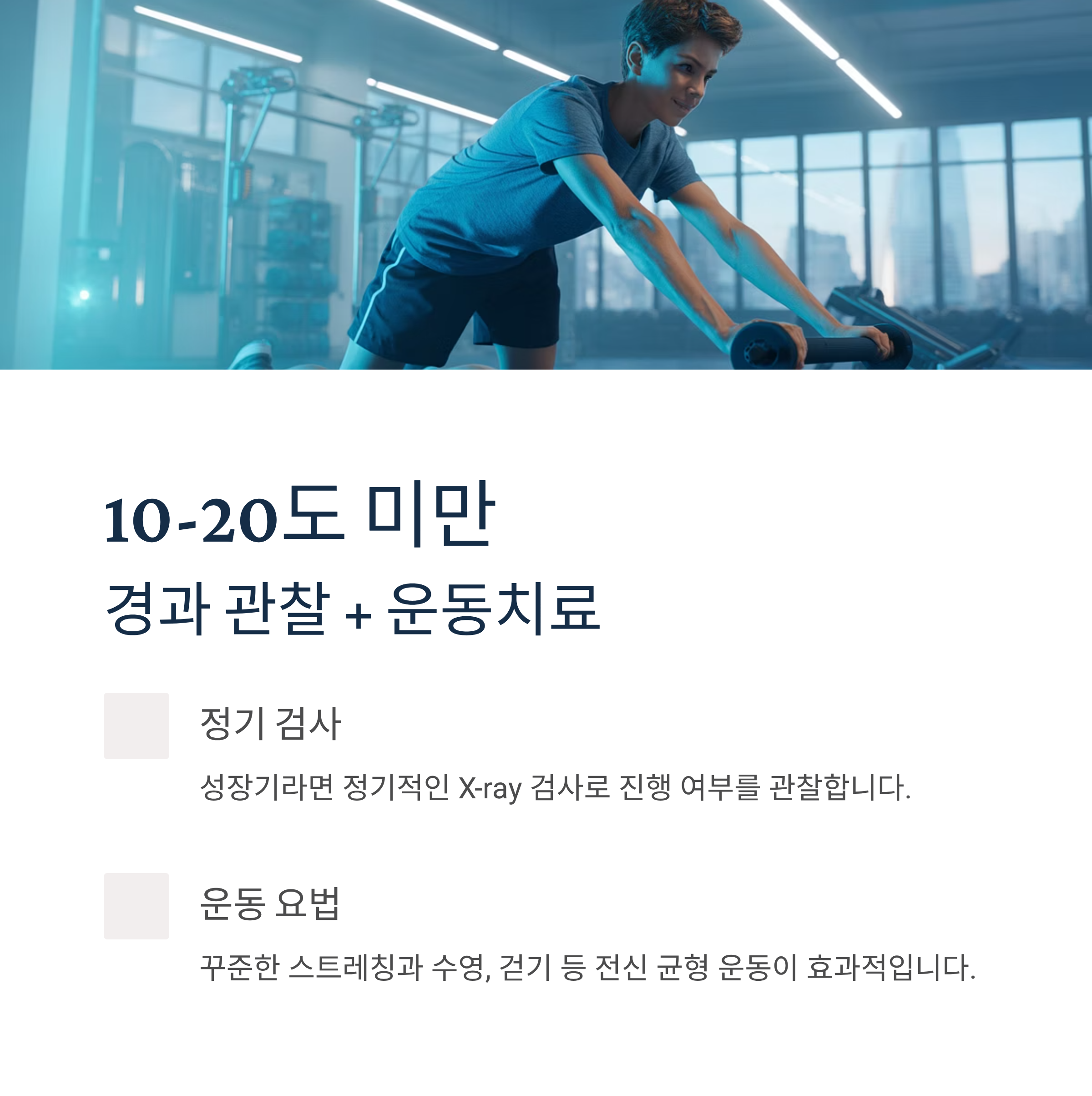 성장기라면 정기적인 X-ray 검사로 진행 여부를 관찰합니다. 꾸준한 스트레칭과 수영, 걷기 등 전신 균형 운동이 효과적입니다.