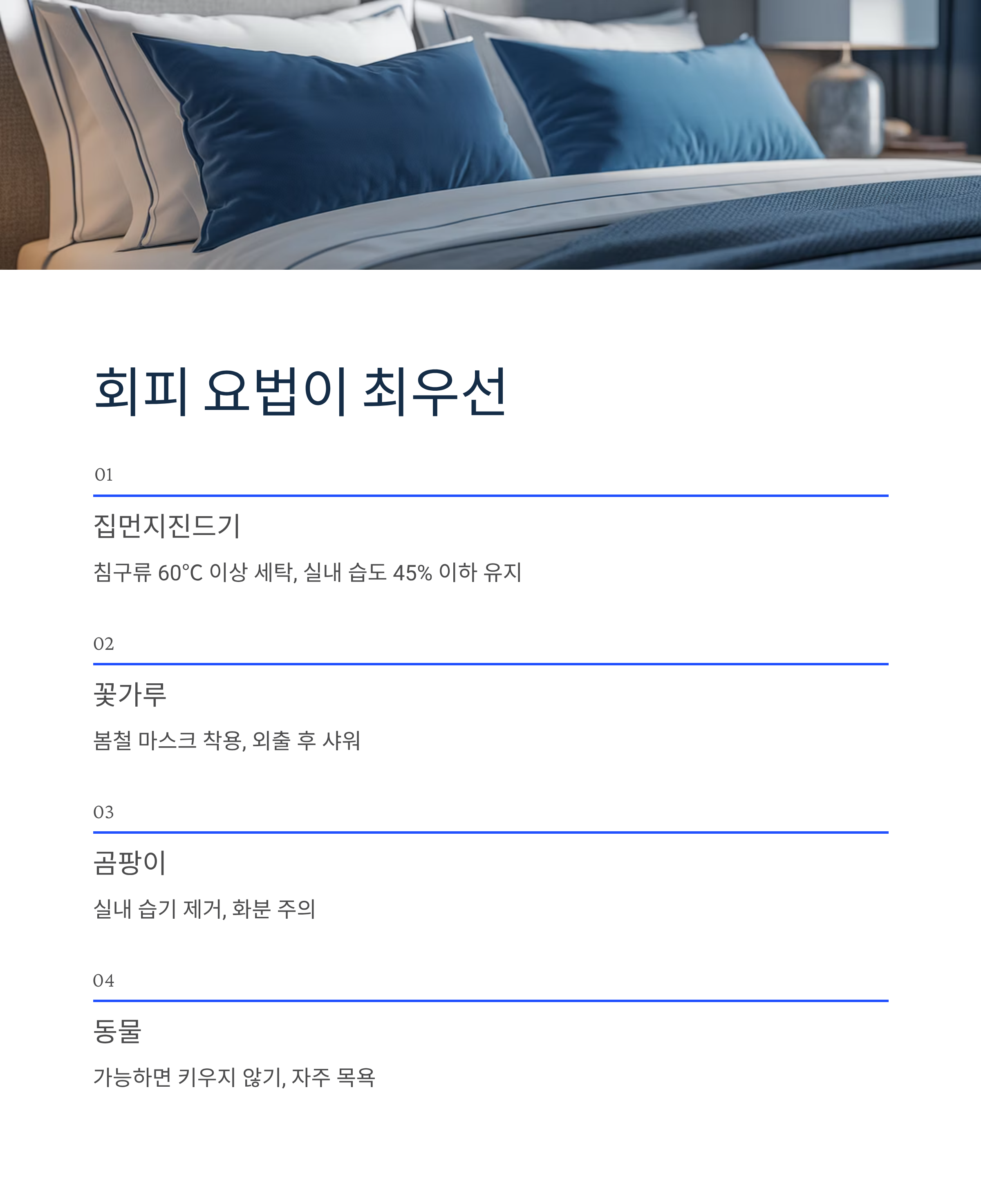 - 집먼지진드기: 침구류를 60℃ 이상 뜨거운 물로 세탁, 실내 습도 45% 이하 유지