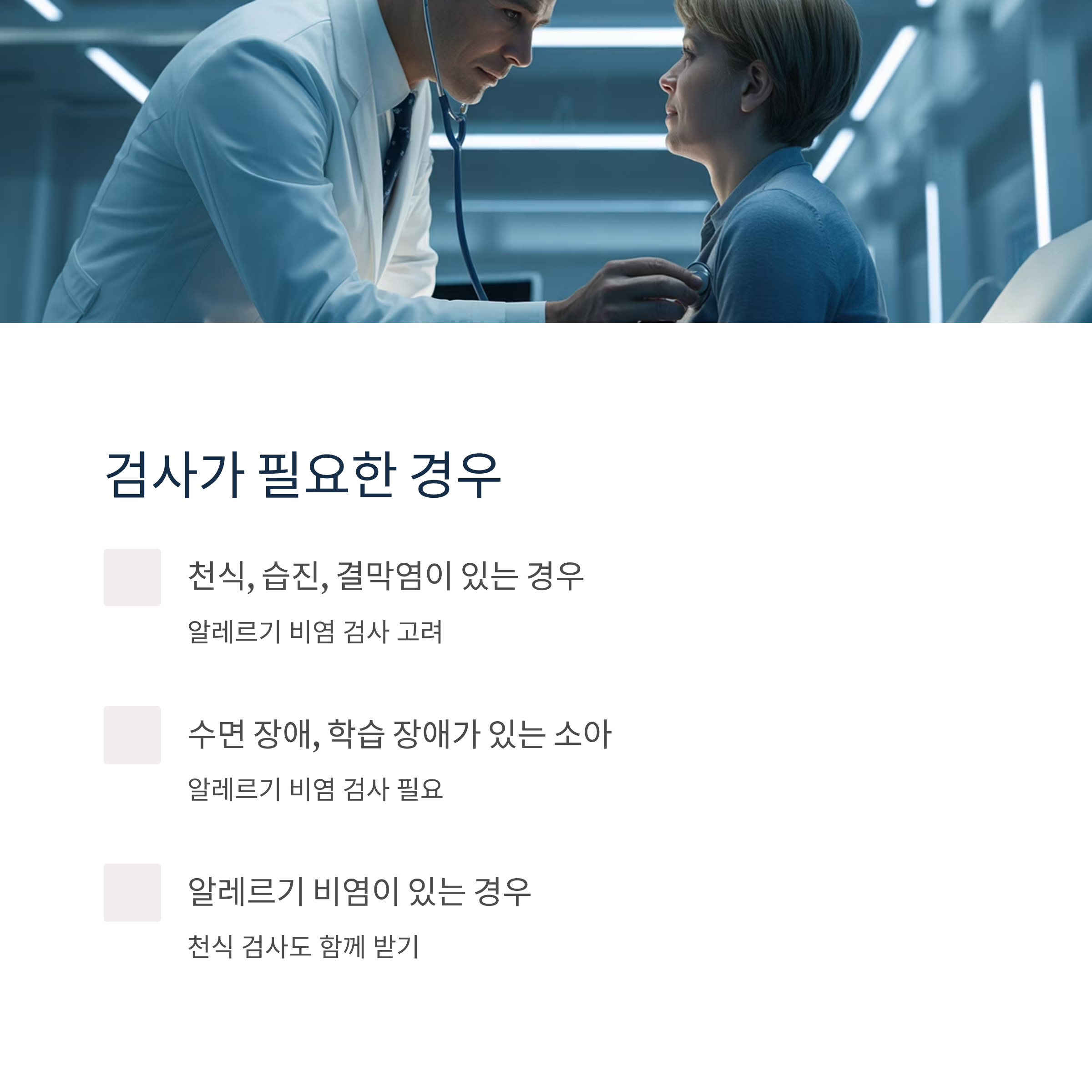 천식, 습진, 결막염, 부비동염이 있는 사람과 수면 장애, 학습 장애가 있는 소아는 알레르기 비염 검사를 고려해야 합니다. 반대로 알레르기 비염이 있다면 천식 검사도 함께 받아보는 것이 좋습니다.