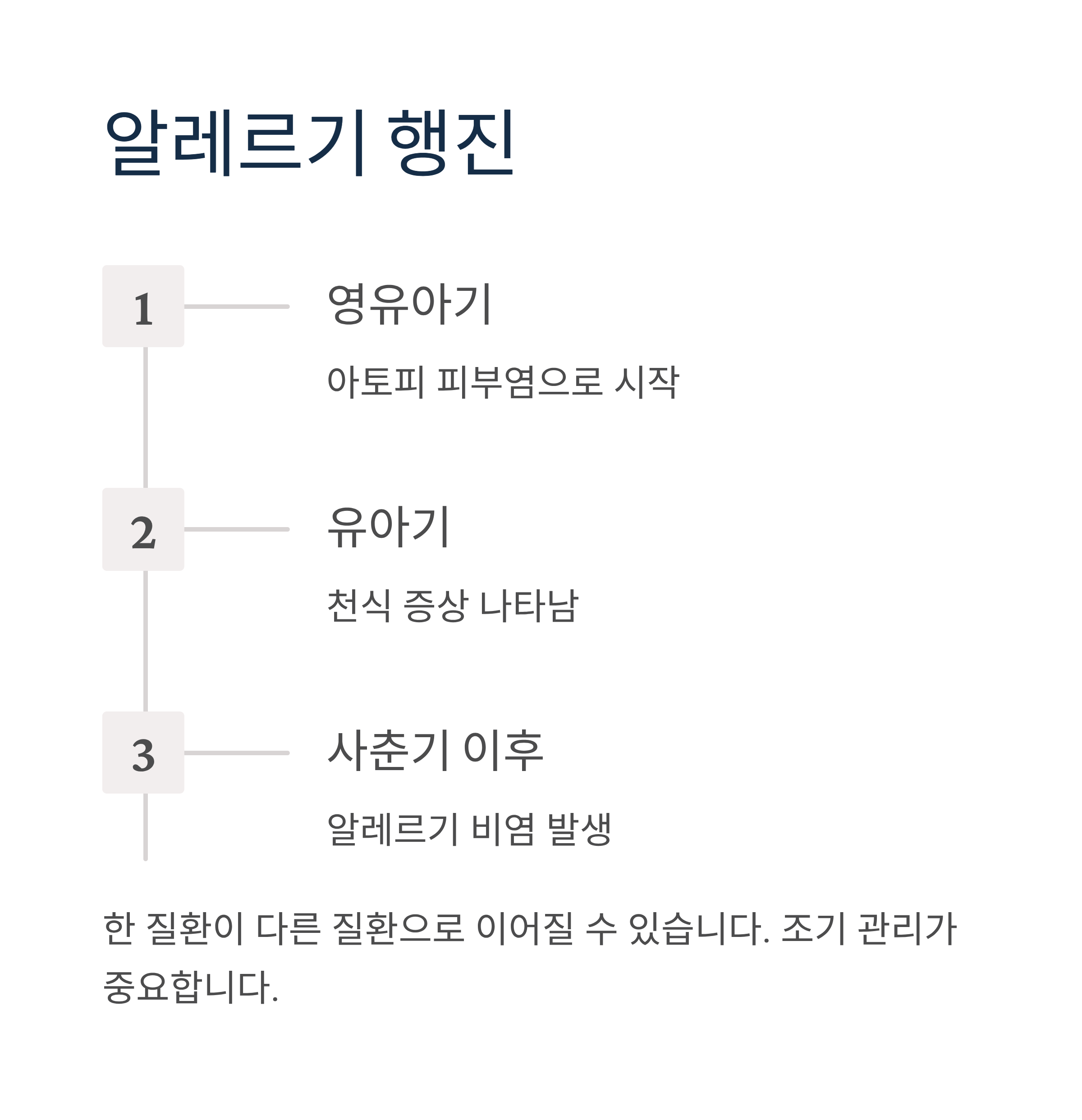 영유아기에는 아토피 피부염으로 시작해, 이후 천식이 나타나고, 사춘기 이후로 비염이 생기는 순서로 발병하는 경우가 많습니다. 이를 알레르기 행진이라고 부르며, 한 질환이 다른 질환으로 이어질 수 있음을 의미합니다.