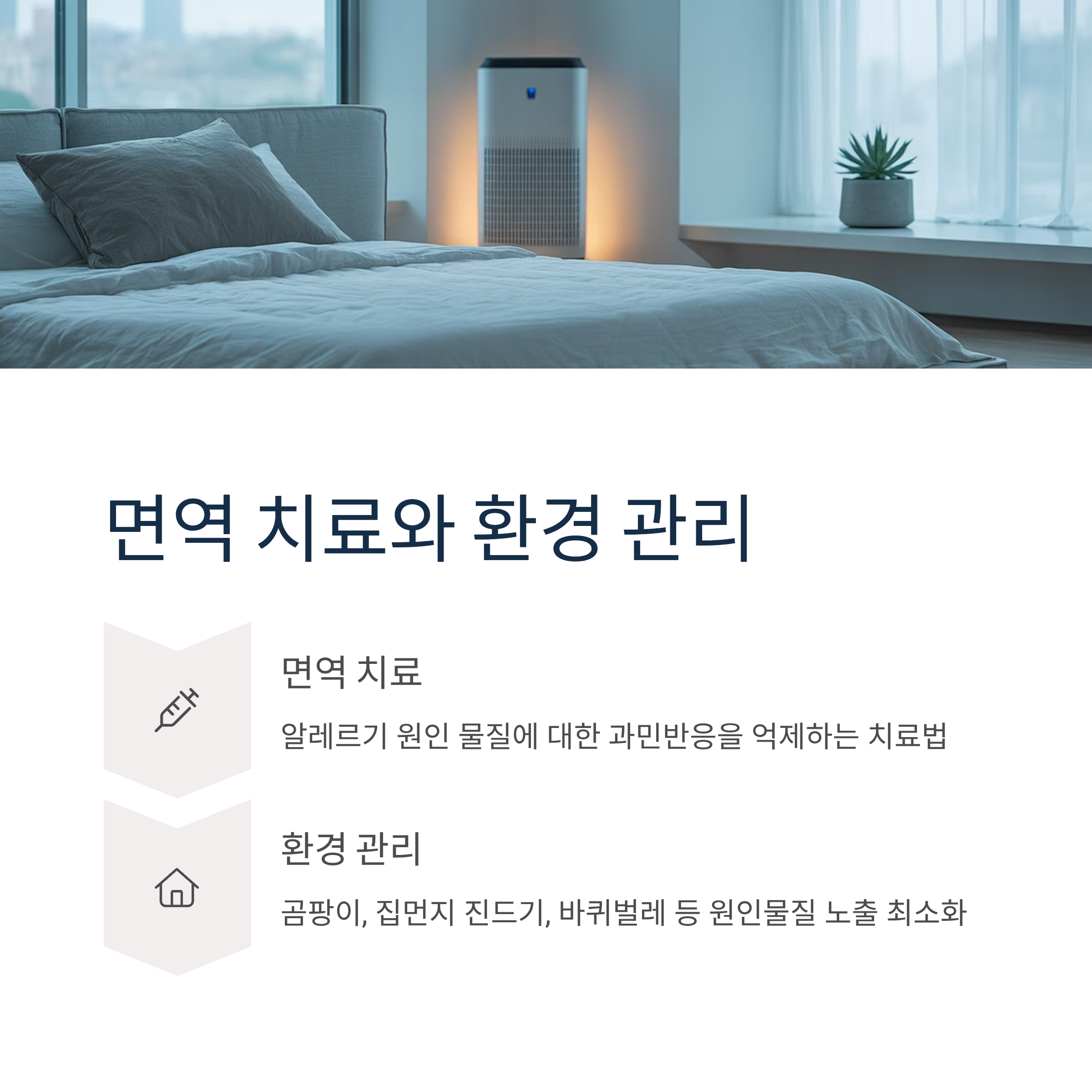면역 치료는 알레르기 원인 물질에 대한 과민반응을 억제하는 치료법으로, 효과가 오랫동안 지속되고 원인 물질에 다시 노출되어도 발작을 예방할 수 있습니다.
