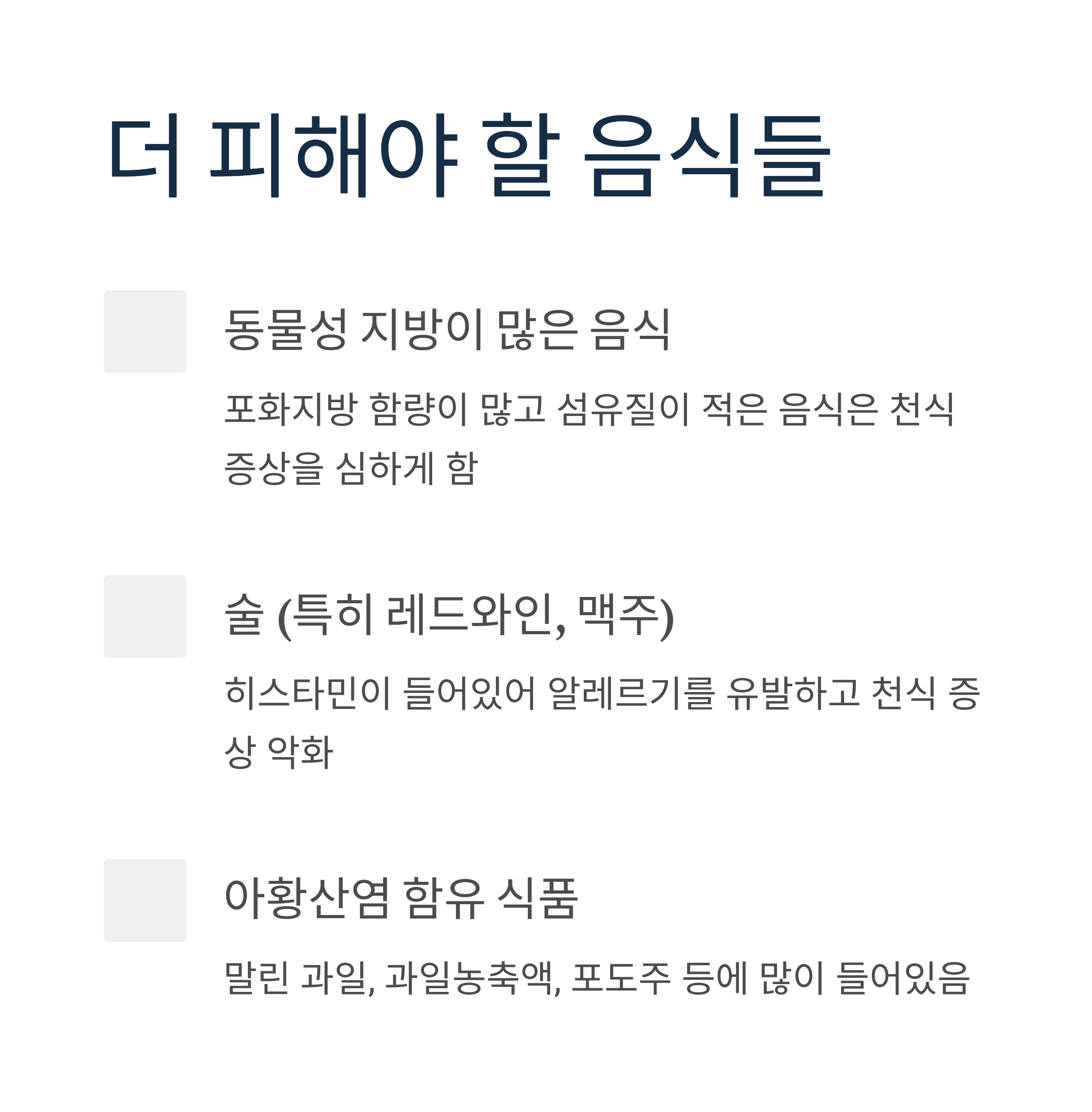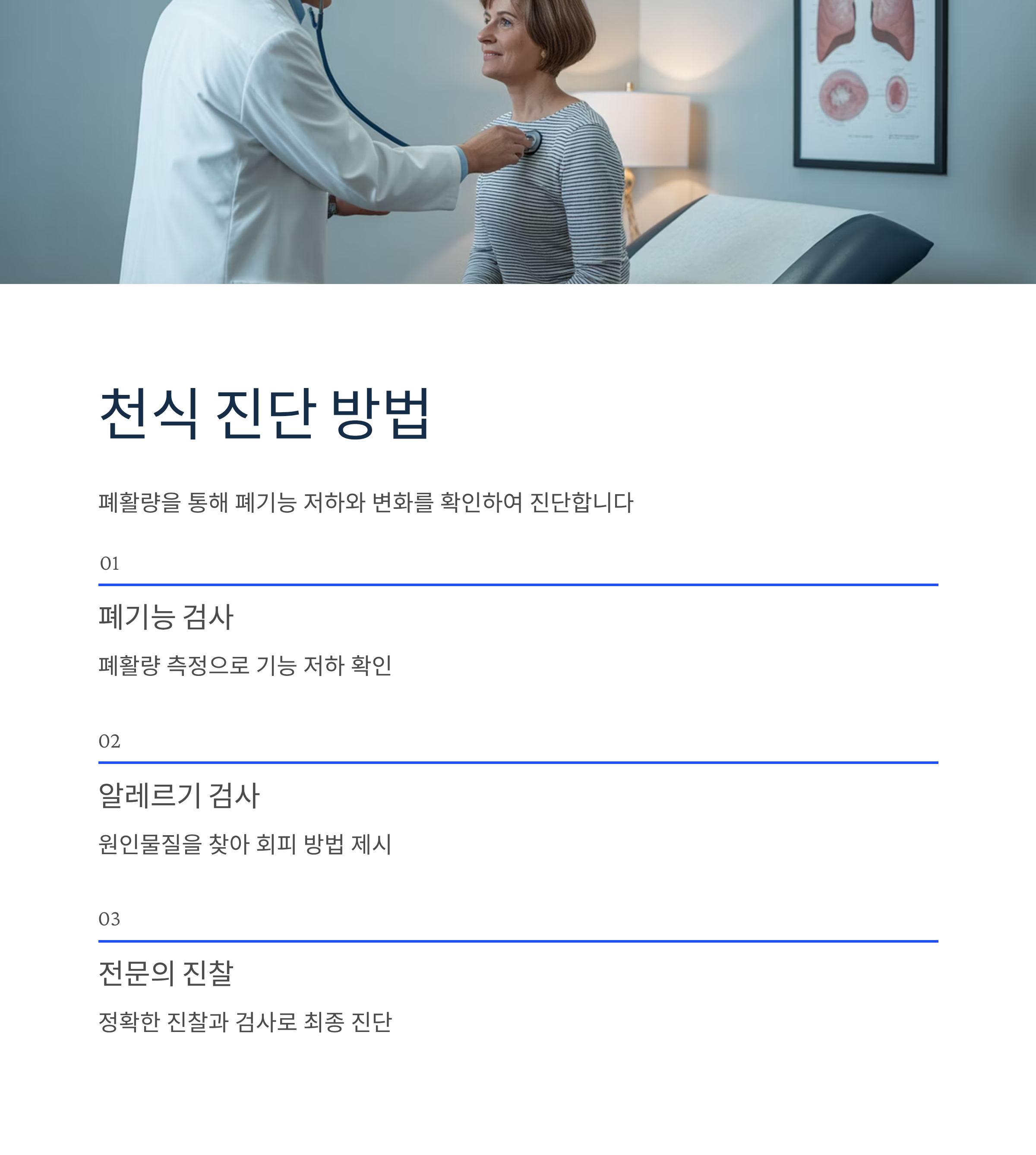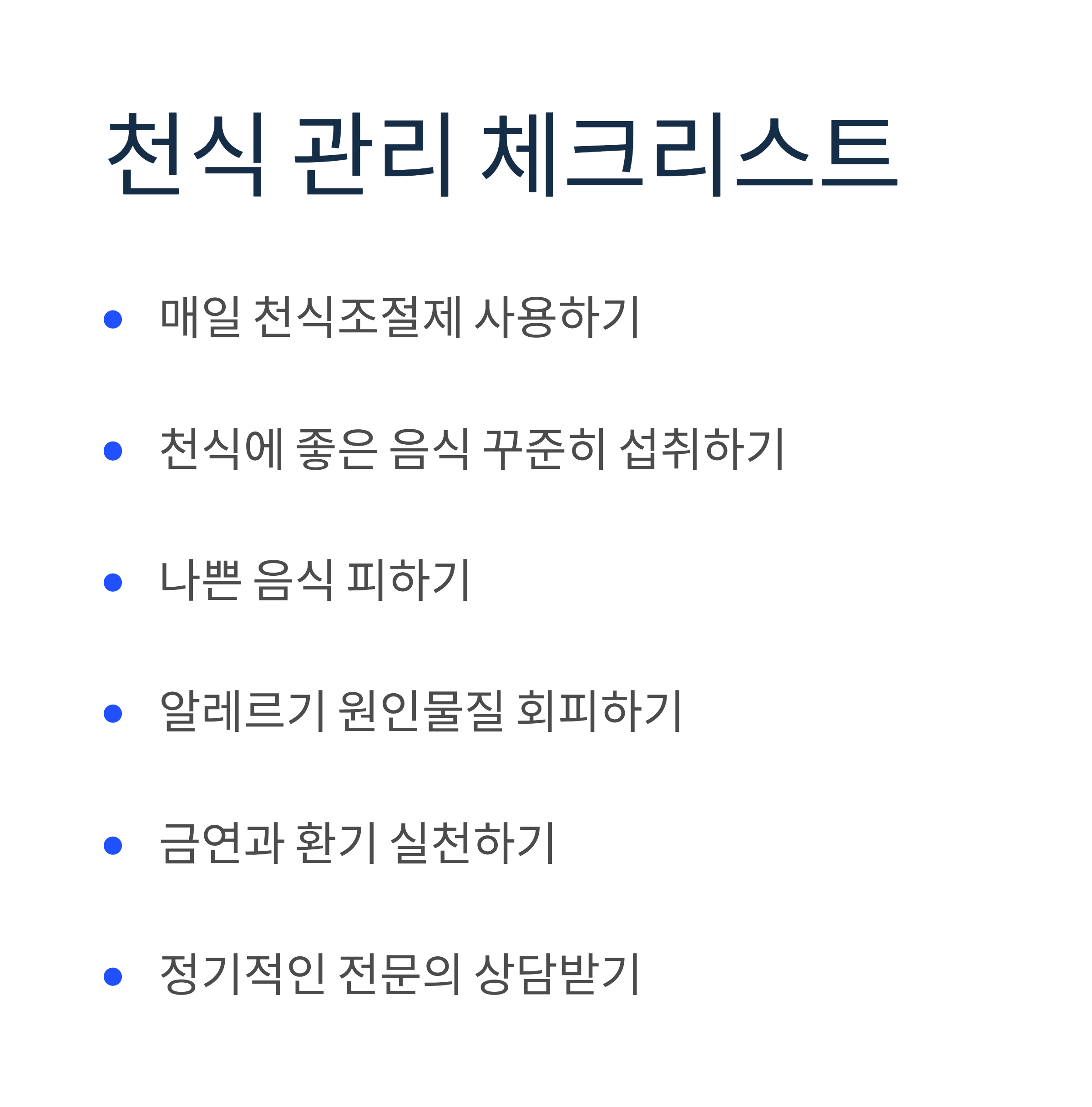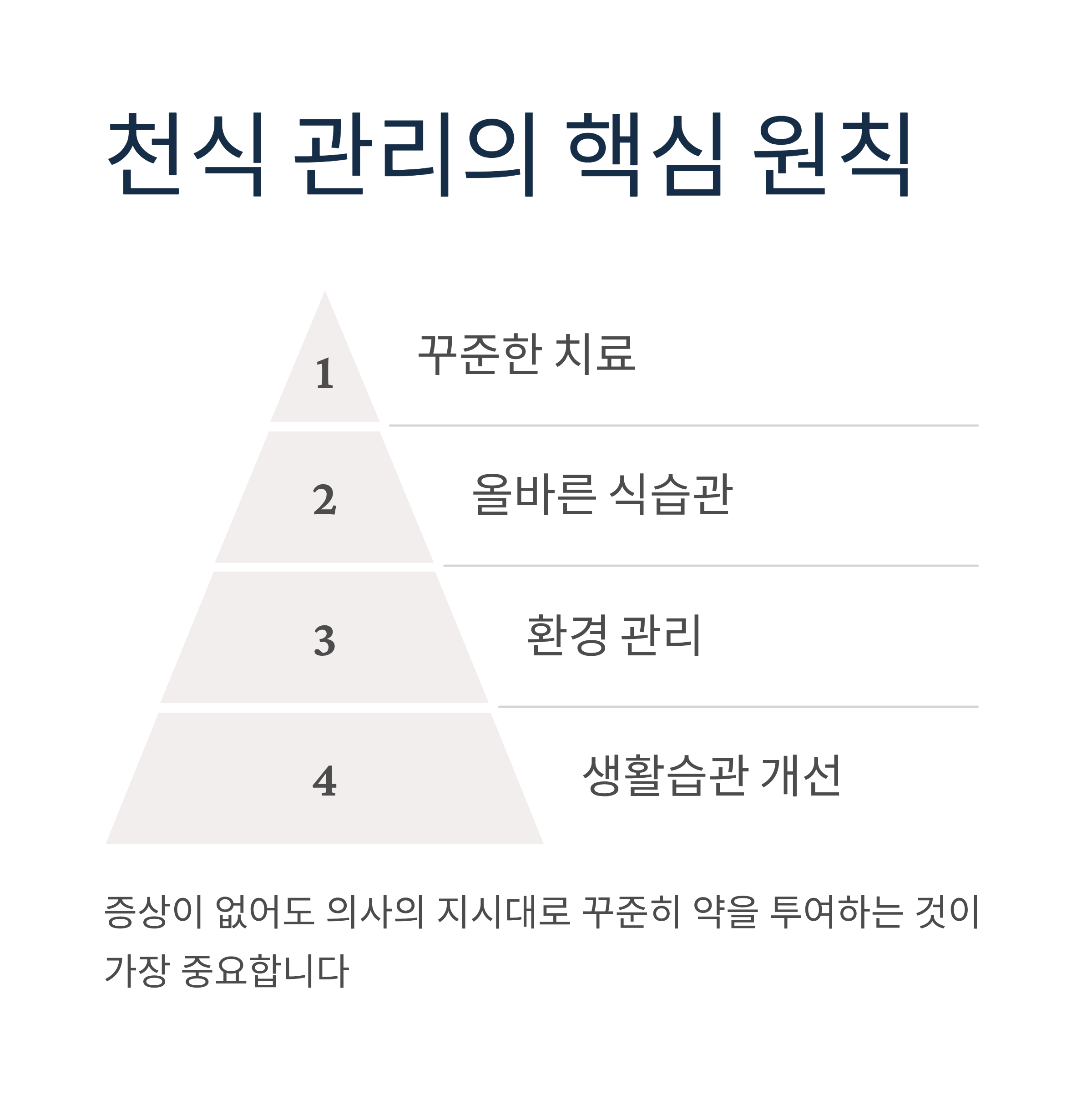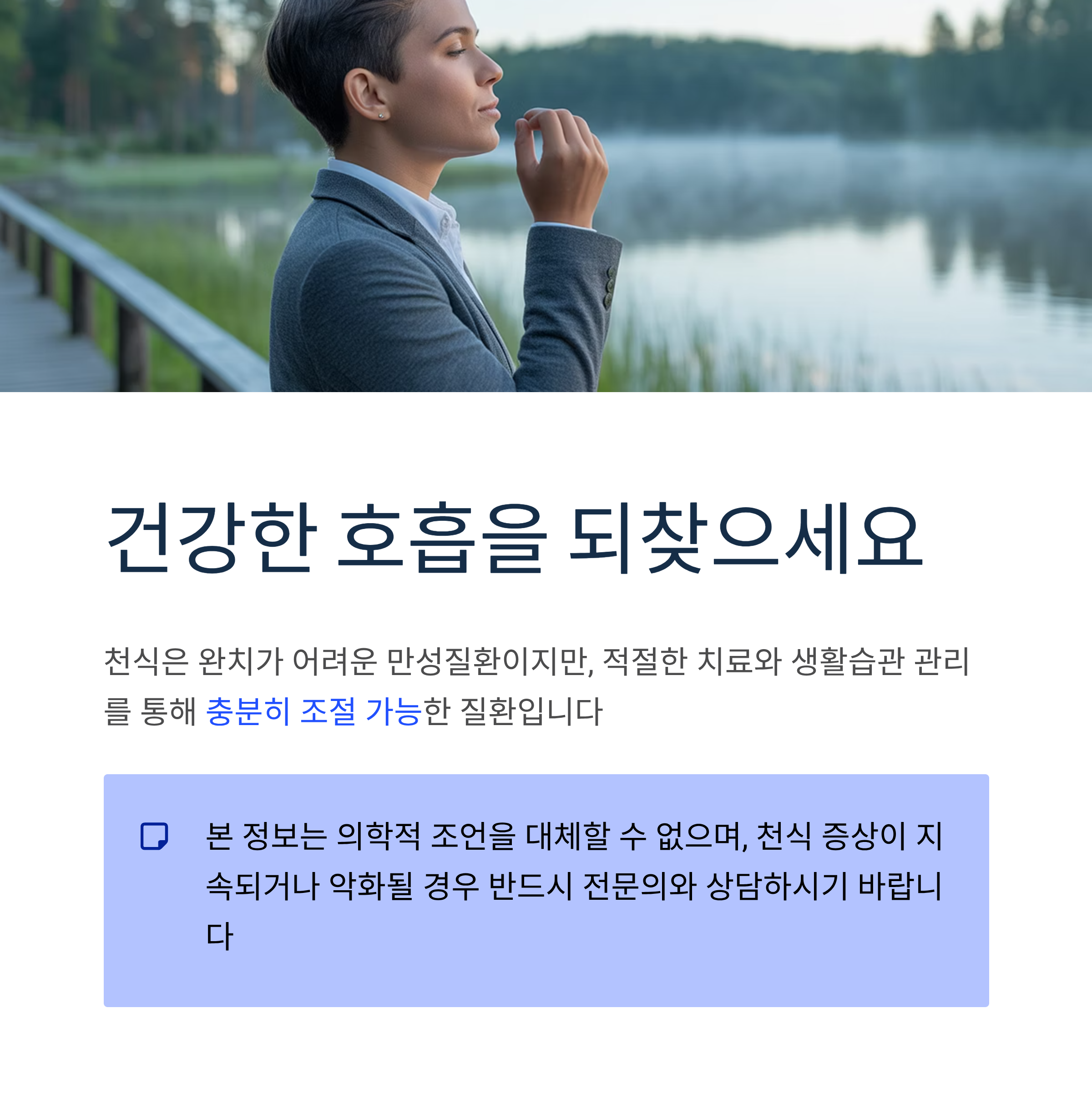 천식은 완치가 어려운 만성질환이지만, 적절한 치료와 생활습관 관리를 통해 충분히 조절 가능한 질환입니다. 특히 올바른 식습관 관리는 천식 증상 완화에 중요한 역할을 합니다.
