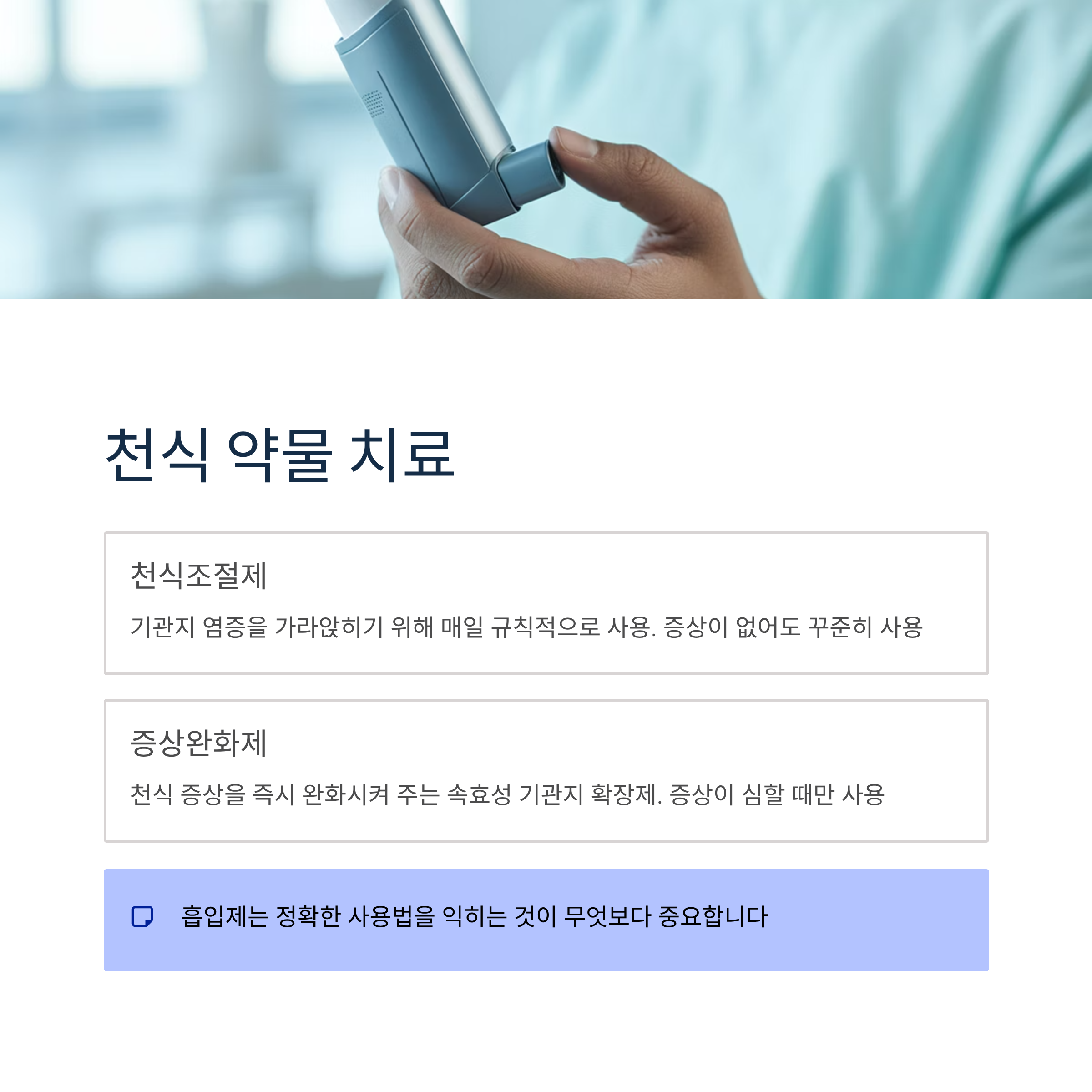 천식조절제: 기관지 염증을 가라앉히기 위해 매일 규칙적으로 사용하며 증상이 없어도 꾸준히 사용해야 합니다.