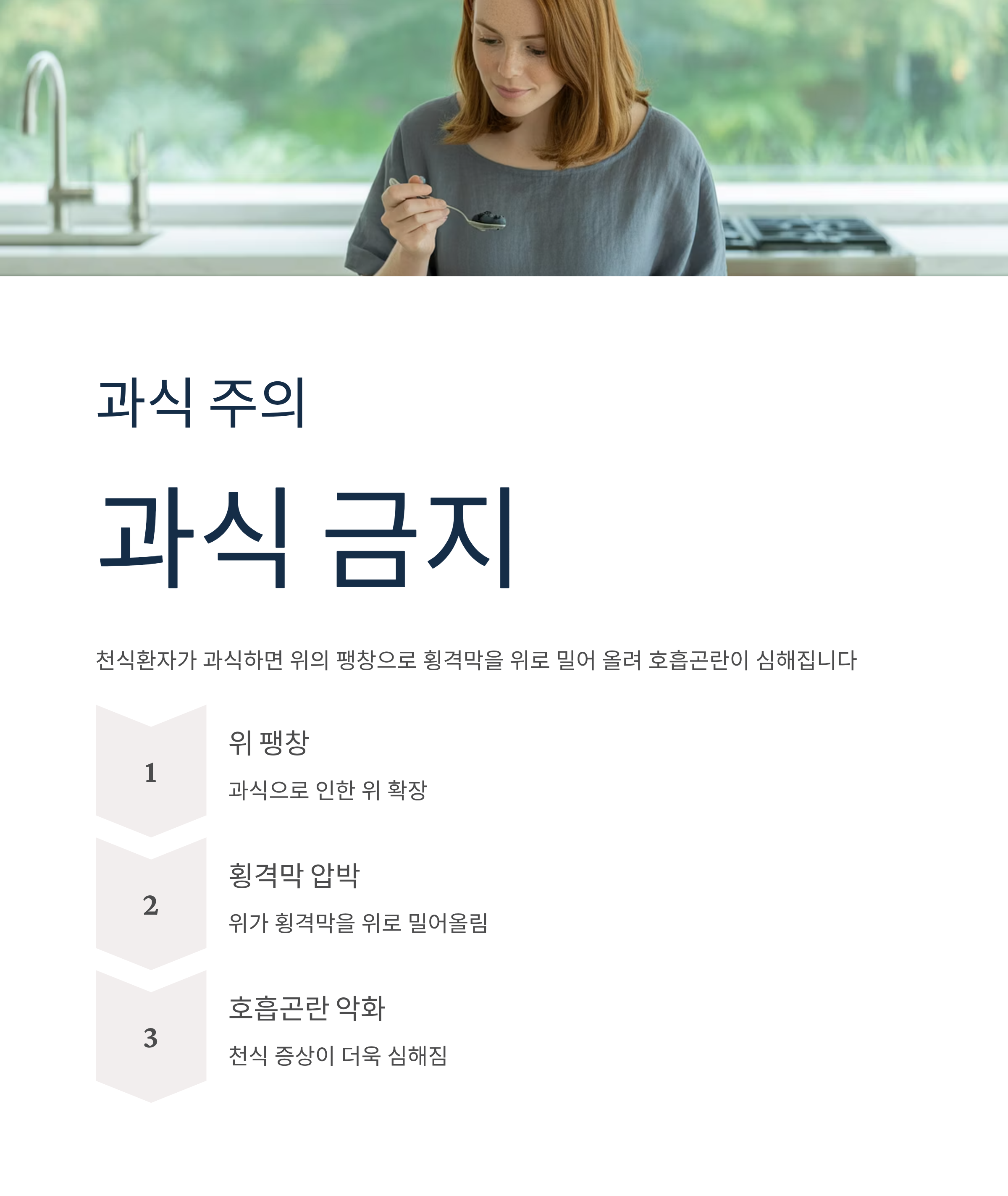 천식환자가 과식을 하면 위의 팽창으로 횡격막을 위로 밀어 올려서 호흡곤란이 심해질 수 있으므로 과식을 피하는 것이 좋습니다.