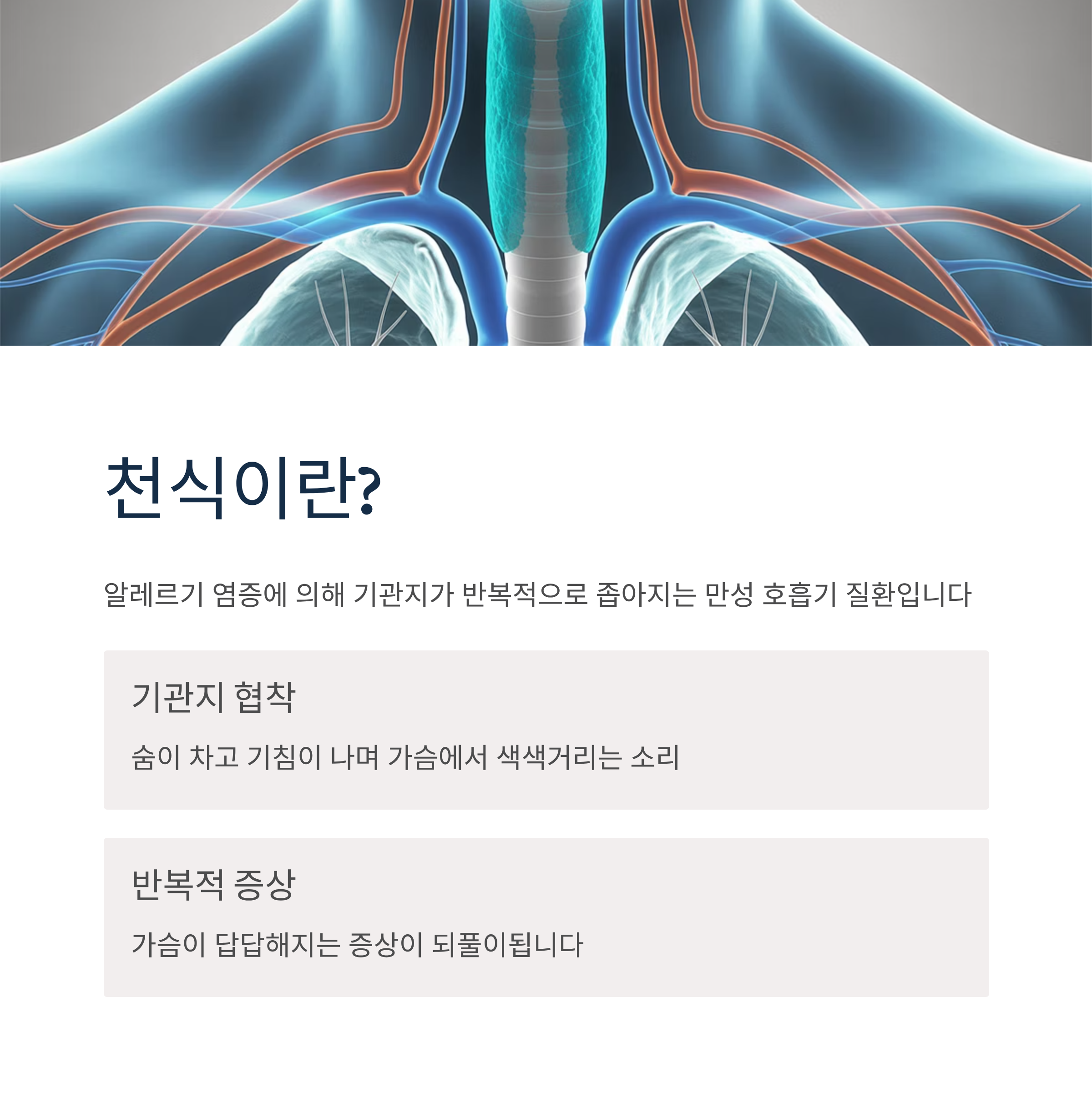 천식은 알레르기 염증에 의해 기관지가 반복적으로 좁아지는 만성 호흡기 질환입니다. 기관지가 좁아져서 숨이 차고, 기침이 나며, 가슴에서 색색거리는 소리가 들리고, 가슴이 답답해지는 증상이 반복적으로 되풀이됩니다.