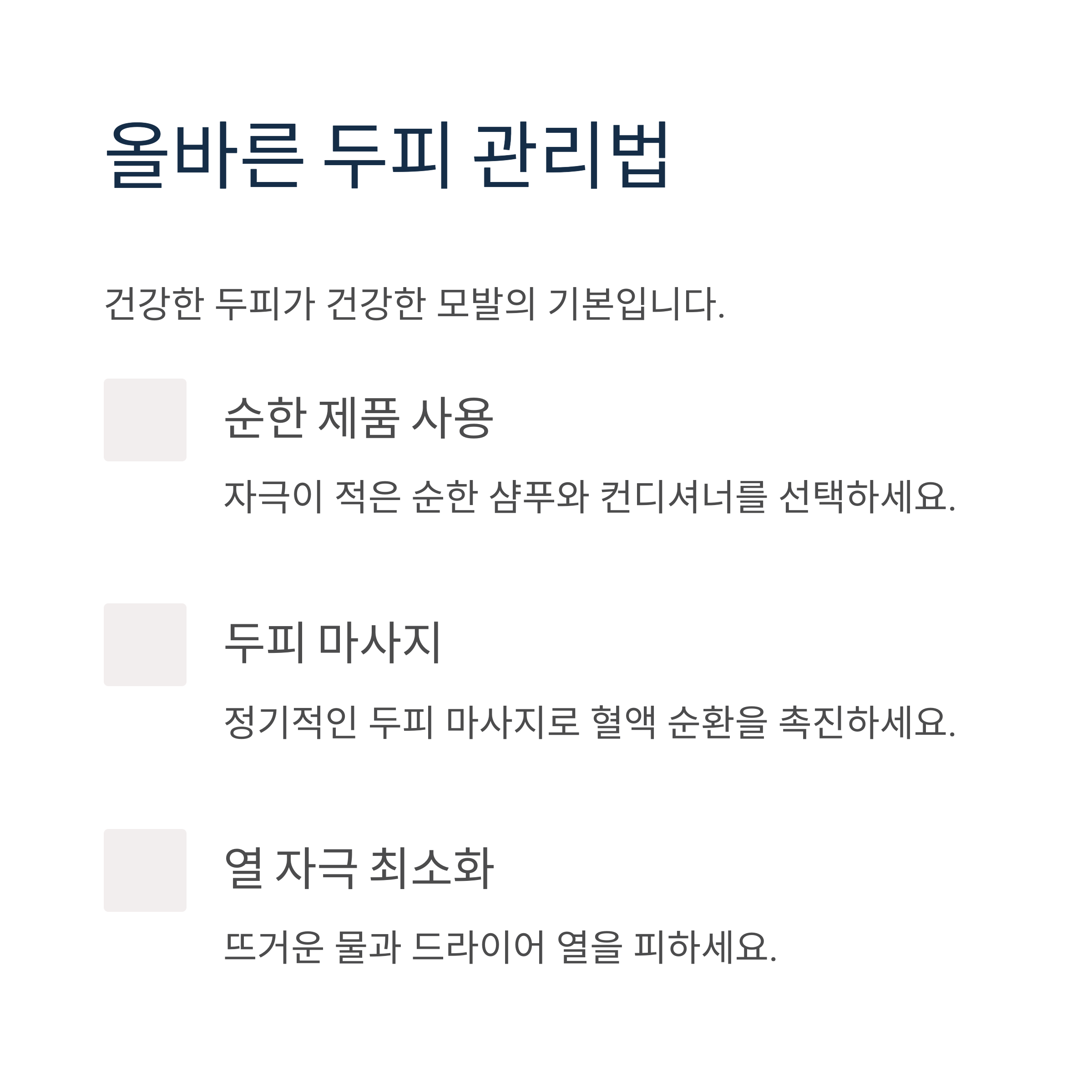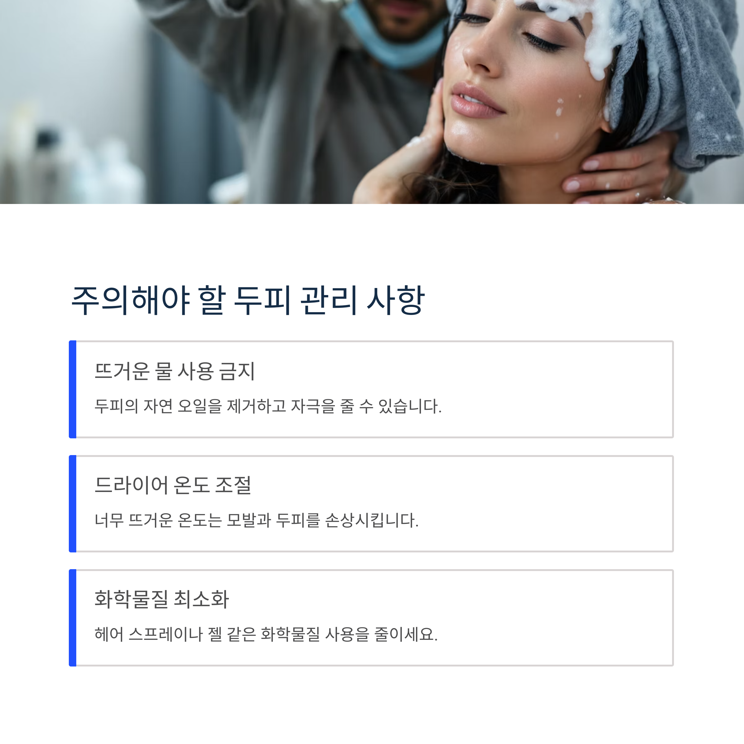 순한 샴푸와 컨디셔너를 사용하여 두피를 자극하지 않도록 하며, 정기적인 두피 마사지를 통해 혈액 순환을 촉진할 수 있습니다.