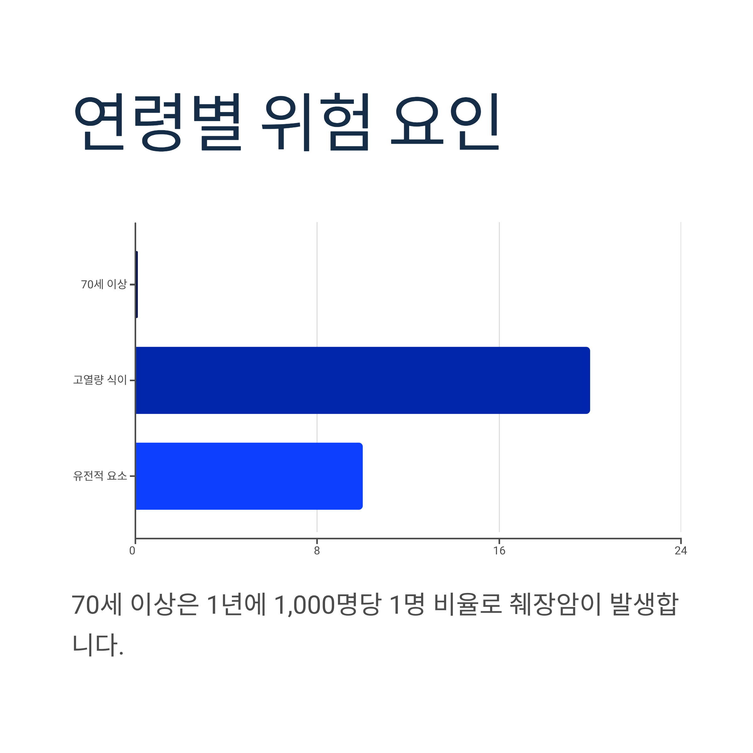 70세 이상은 1년에 1,000명당 1명 비율로 췌장암이 발생하며, 고열량 식이(20%), 유전적 요소(10%)도 주요 위험인자입니다.
