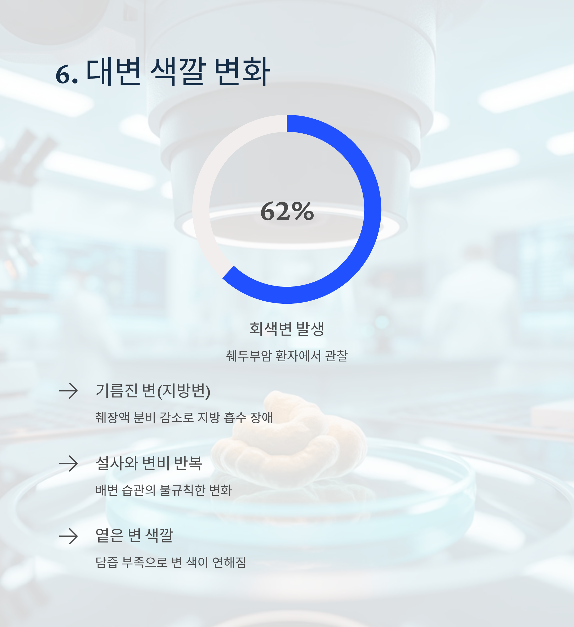 췌두부암 환자의 62%에서 회색변이나 기름진 변(지방변)이 관찰됩니다. 설사와 변비가 반복되거나 변의 색이 옅어지는 증상도 주의해야 합니다.