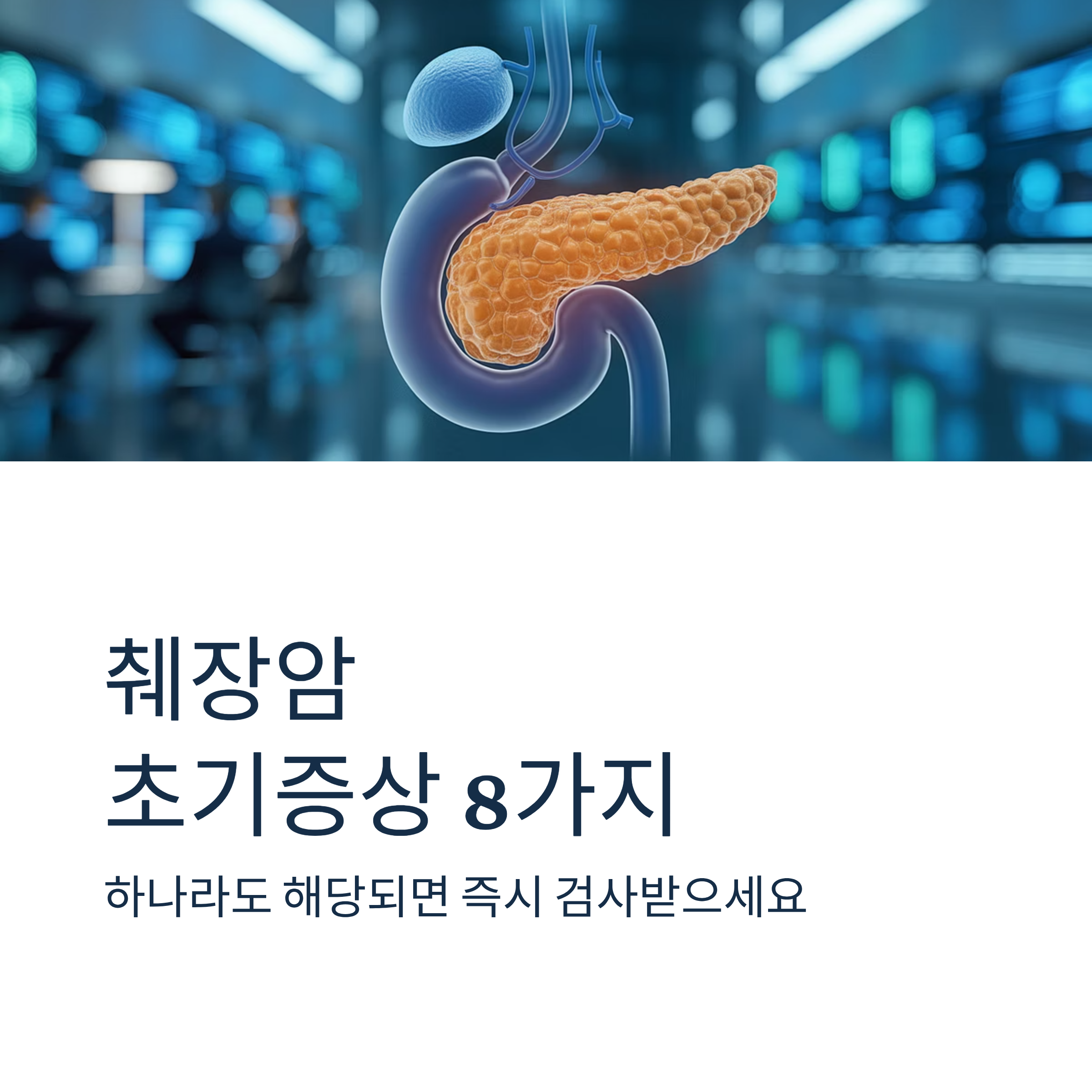 복부 초음파, CT, MRI, 내시경 초음파, 혈청종양표지자(CA19-9) 검사 등으로 진단하며, 고위험군은 정기적인 검진이 필수입니다. 위 증상 중 3가지 이상 해당된다면 지체 없이 전문의 상담을 받으시기 바랍니다.