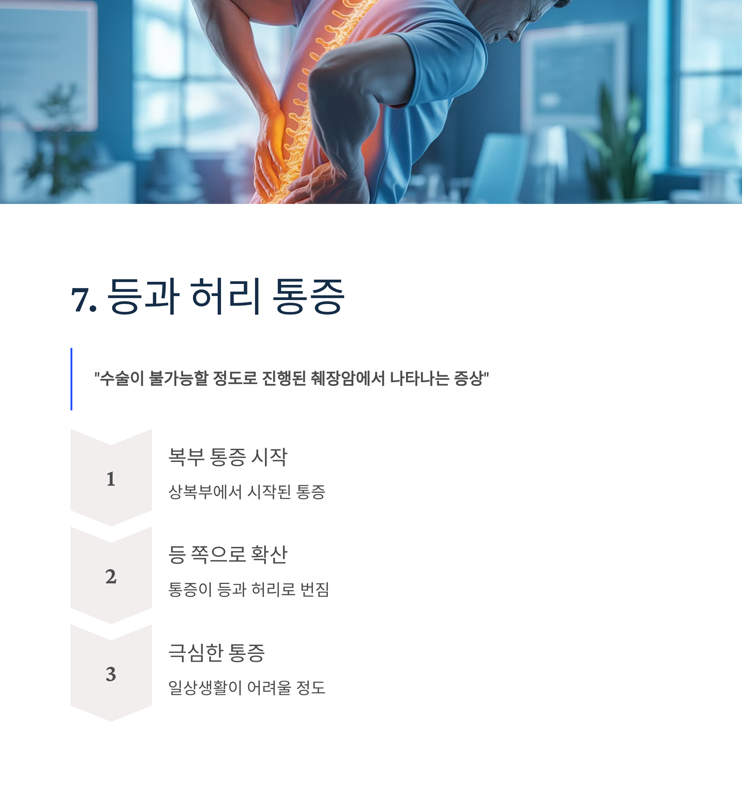 수술이 불가능할 정도로 진행된 췌장암에서 나타나는 증상입니다. 복부에서 시작된 통증이 등 쪽까지 번지며 일상생활이 어려울 정도의 극심한 통증을 호소합니다.