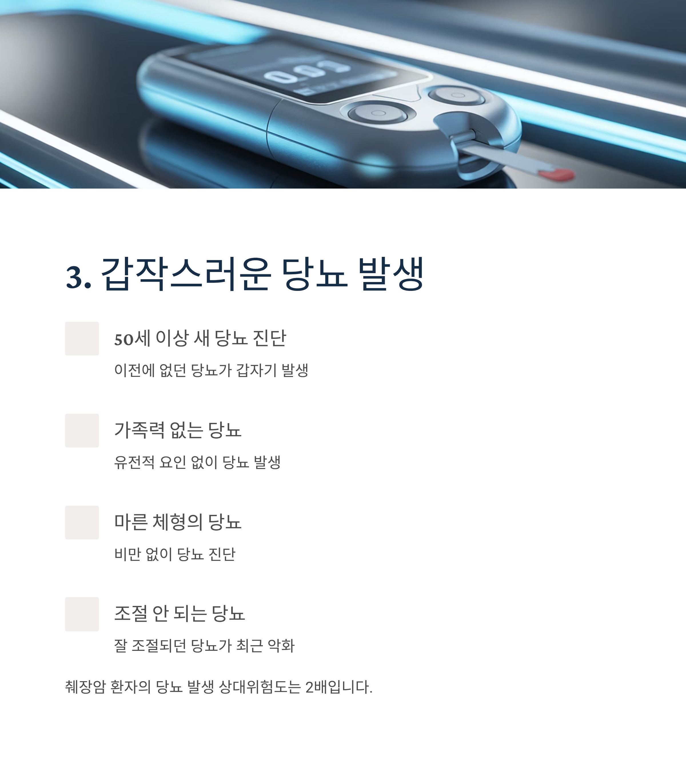 50세 이상에서 새롭게 당뇨병이 진단되거나, 당뇨병 가족력이 없는데 당뇨가 발생한 경우, 마른 체형에서 생긴 당뇨, 잘 조절되던 당뇨가 최근 들어 조절이 안 되는 경우 췌장암을 의심하고 정밀검사를 받아야 합니다. 췌장암 환자의 당뇨 발생 상대위험도는 2배입니다.