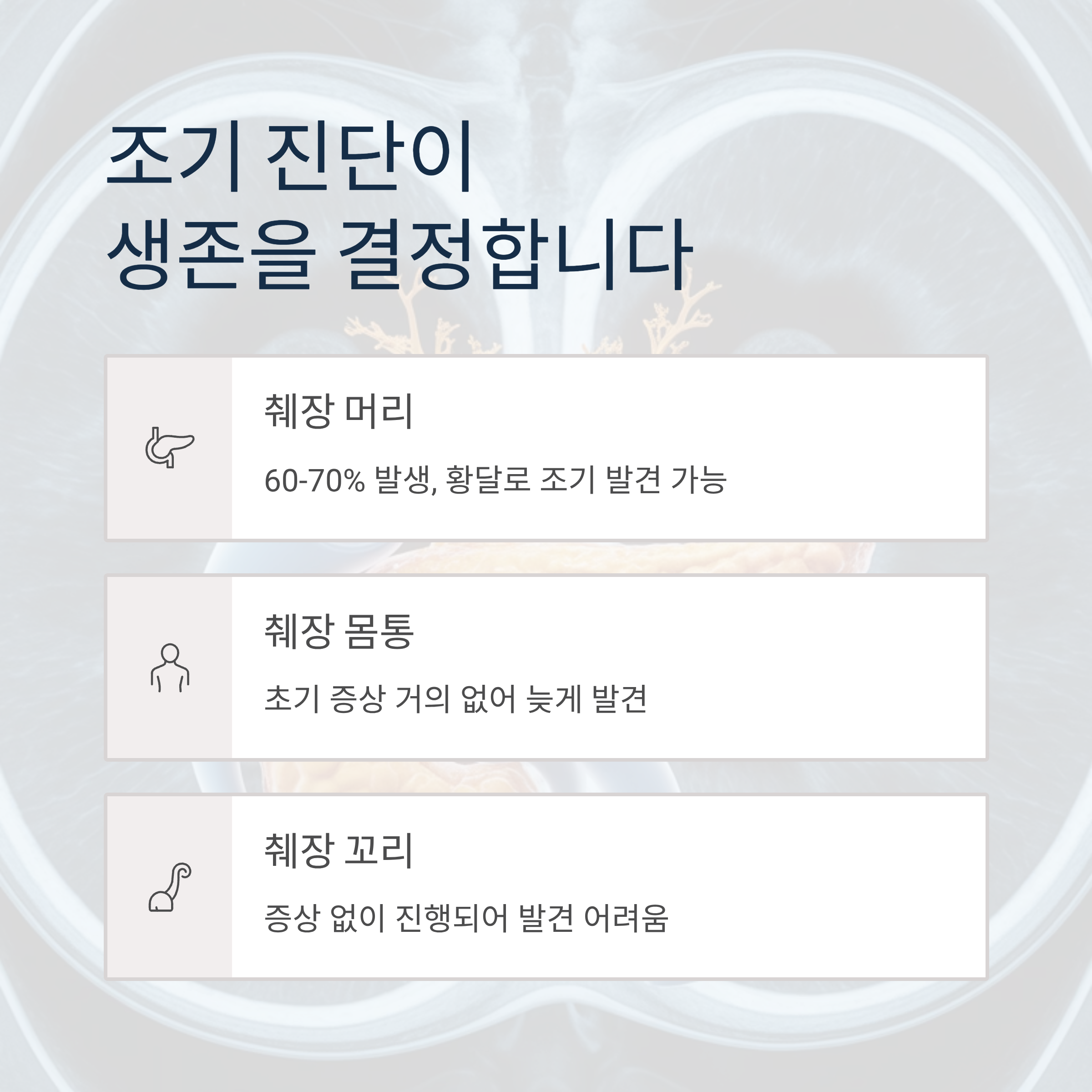 췌장암은 위치에 따라 발견 시기가 다릅니다. 췌장 머리 부분(60~70%)에 발생하면 담관 폐쇄로 황달이 생겨 비교적 조기 발견이 가능하지만, 몸통과 꼬리 부분은 초기 증상이 거의 없어 늦게 발견됩니다.