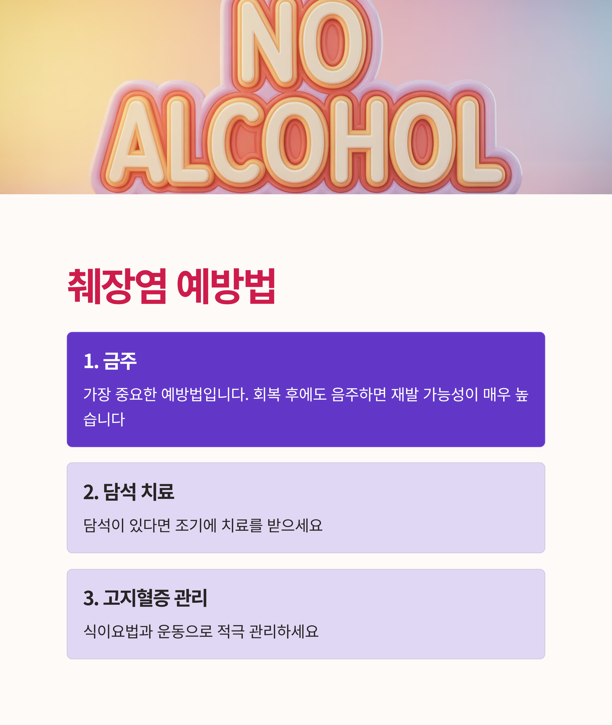 가장 중요한 예방법은 금주입니다. 급성 췌장염이 회복된 후에도 음주를 하면 재발 가능성이 매우 높습니다. 또한 담석이 있는 경우 조기 치료를 받고, 고지혈증이 있다면 식이요법과 운동으로 적극 관리해야 합니다. 정기적인 건강검진도 필수입니다.