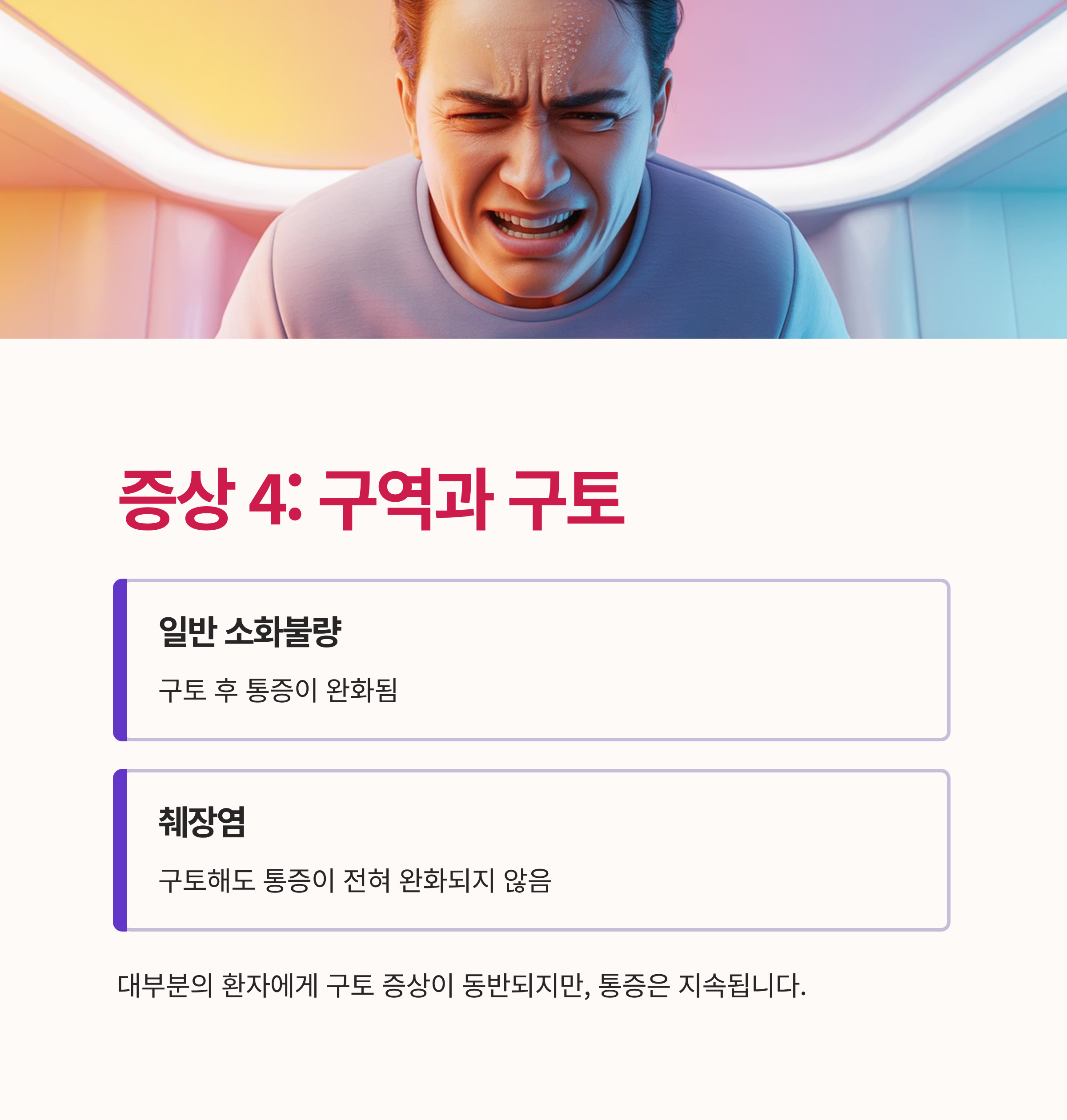 대부분의 환자에게 구토 증상이 동반됩니다. 하지만 일반적인 소화불량과 달리 구토를 해도 통증이 전혀 완화되지 않는 것이 특징입니다.