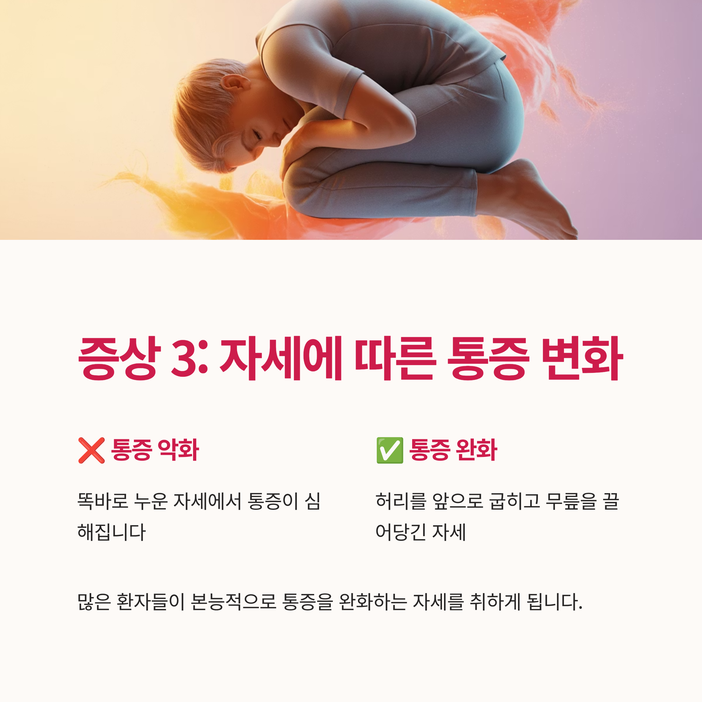 똑바로 누우면 통증이 악화되는 것이 특징입니다. 많은 환자들이 본능적으로 허리를 앞으로 굽히고 무릎을 끌어당긴 자세를 취하게 됩니다. 이 자세에서 통증이 다소 완화됩니다.