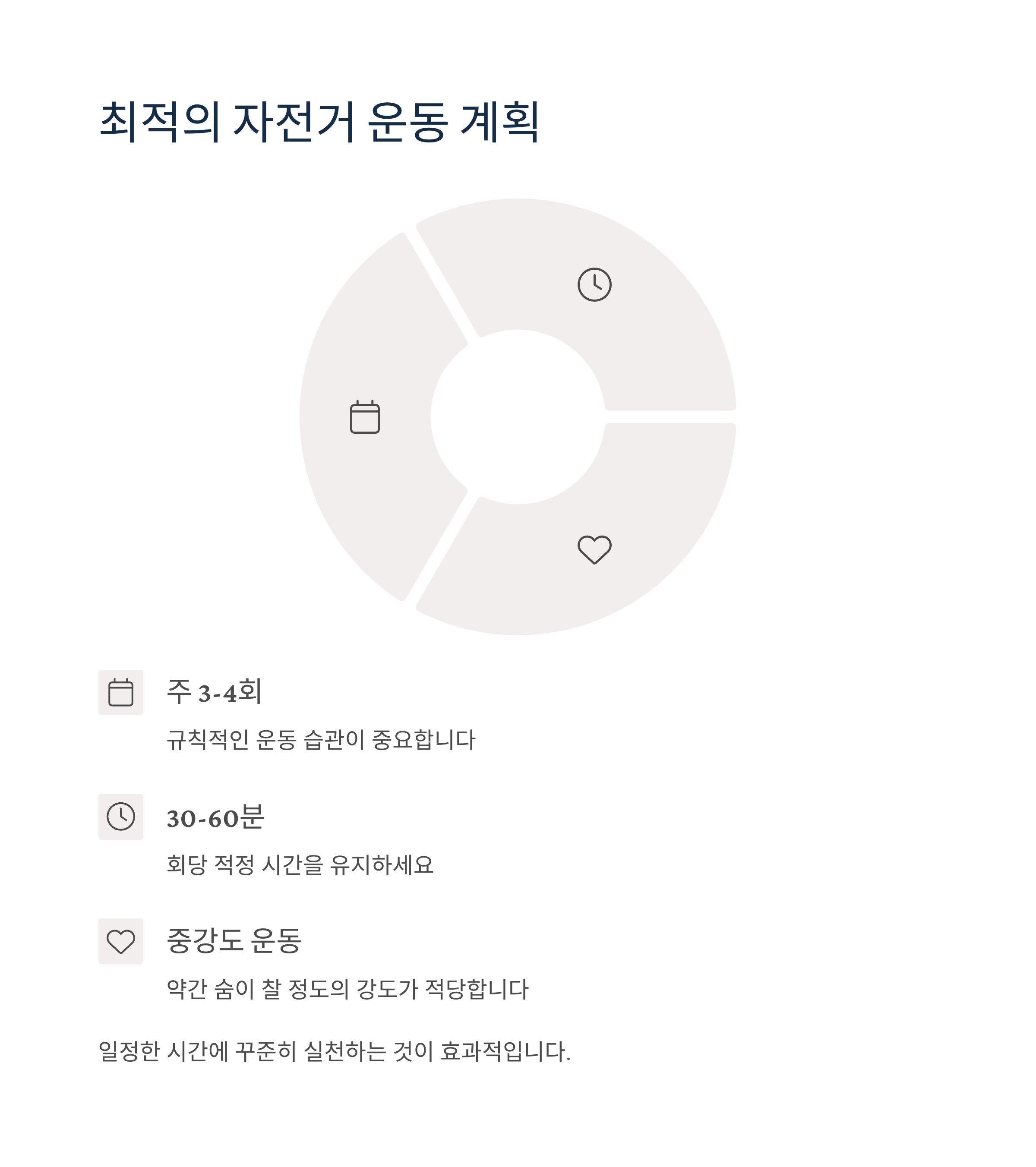 - 몸이 적응되면 주 3-4회, 30-45분으로 점차 늘려가기