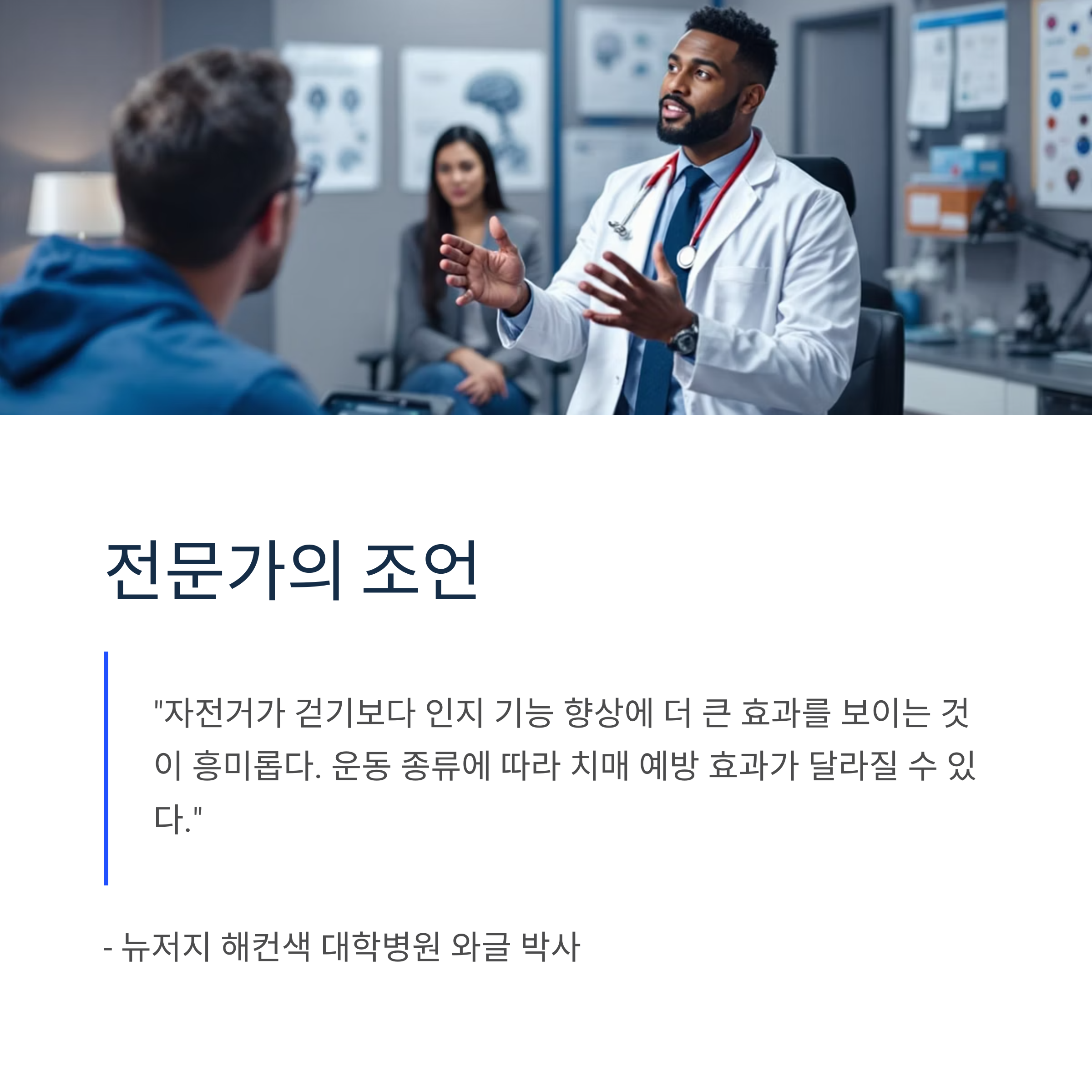 뉴저지 해컨색 대학병원 와글 박사는 "자전거가 걷기보다 인지 기능 향상에 더 큰 효과를 보이는 것이 흥미롭다"며, "운동 종류에 따라 치매 예방 효과가 달라질 수 있다"고 설명했습니다.