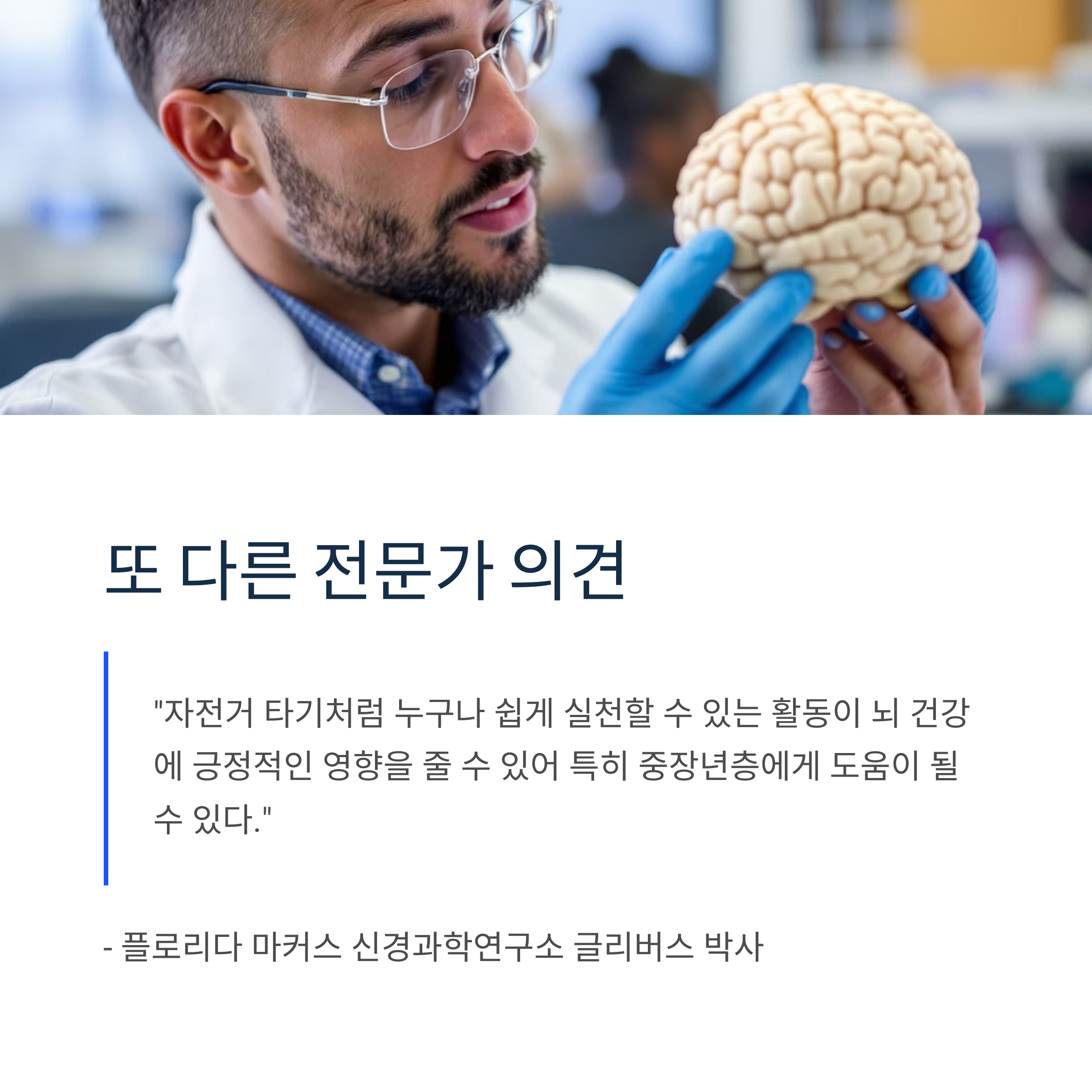 플로리다 마커스 신경과학연구소 글리버스 박사는 "자전거 타기처럼 누구나 쉽게 실천할 수 있는 활동이 뇌 건강에 긍정적인 영향을 줄 수 있어 특히 중장년층에게 도움이 될 수 있다"고 조언했습니다.