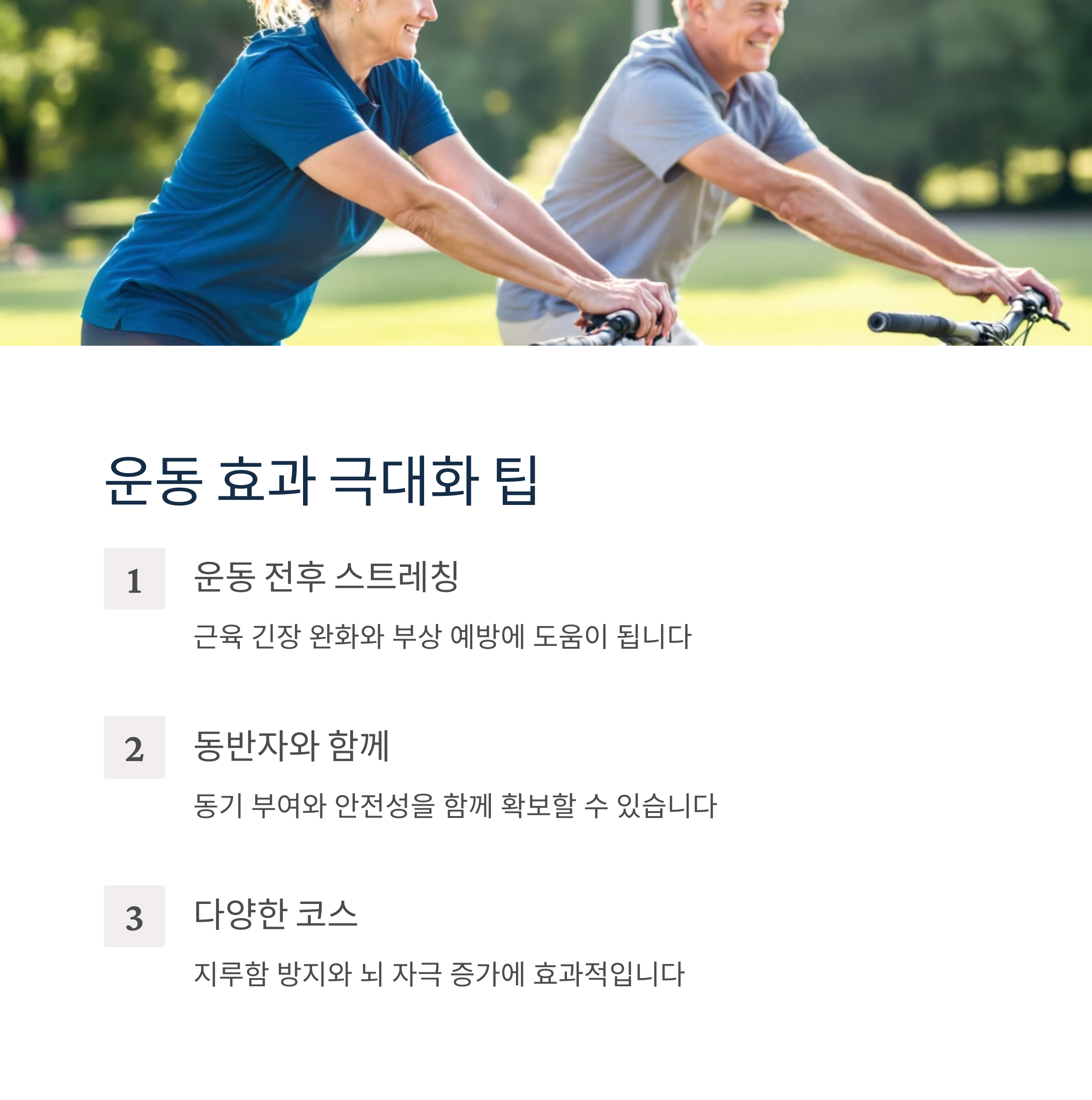 - 균형감각이 떨어지는 고령층은 헬스장이나 집에서 실내 자전거 운동부터 시작