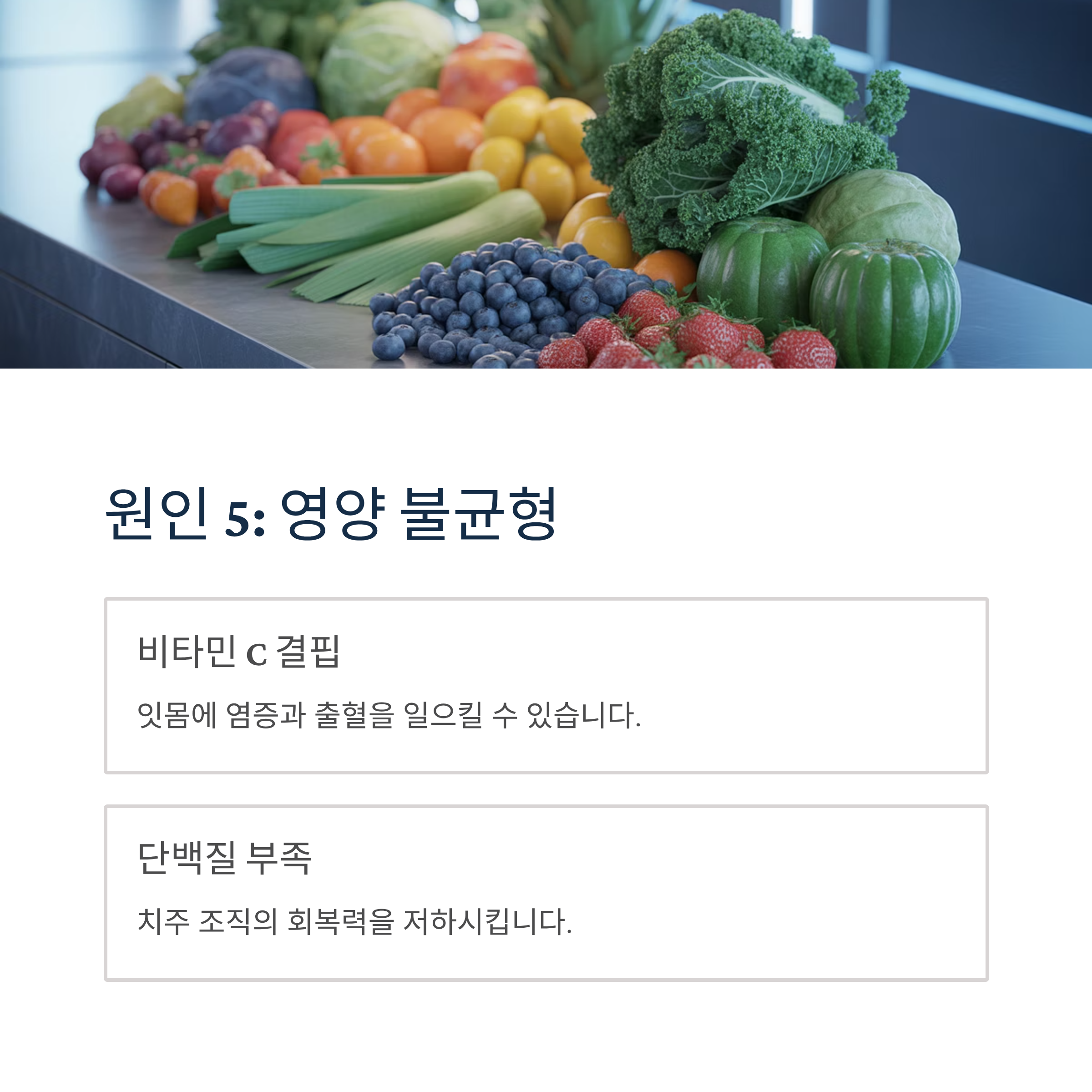 비타민 C 결핍은 잇몸에 염증과 출혈을 일으킬 수 있습니다. 단백질과 비타민이 부족한 식단은 치주 조직의 회복력을 저하시킵니다.