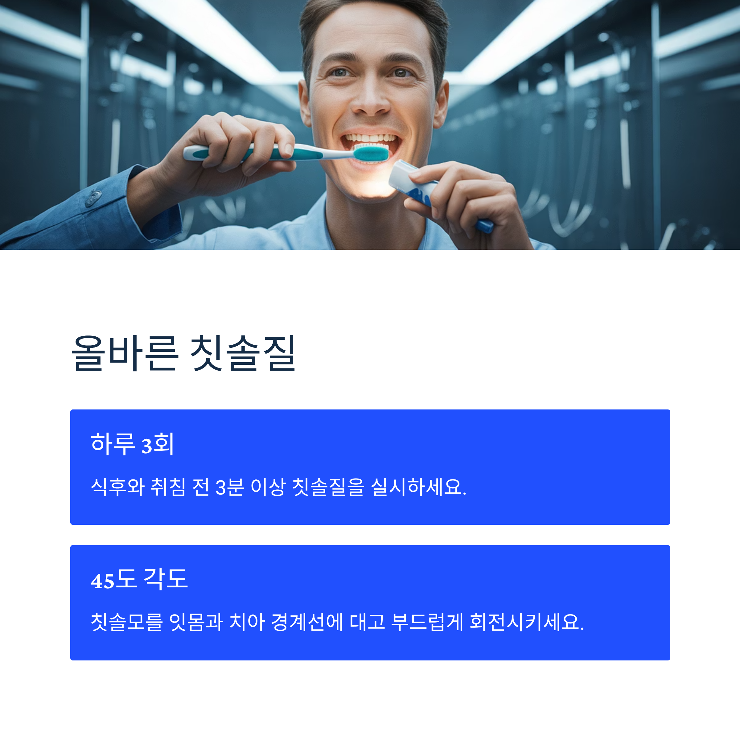 하루 최소 3회, 식후와 취침 전 3분 이상 칫솔질을 실시하세요. 칫솔모를 45도 각도로 잇몸과 치아 경계선에 대고 부드럽게 회전시키며 닦는 것이 효과적입니다.