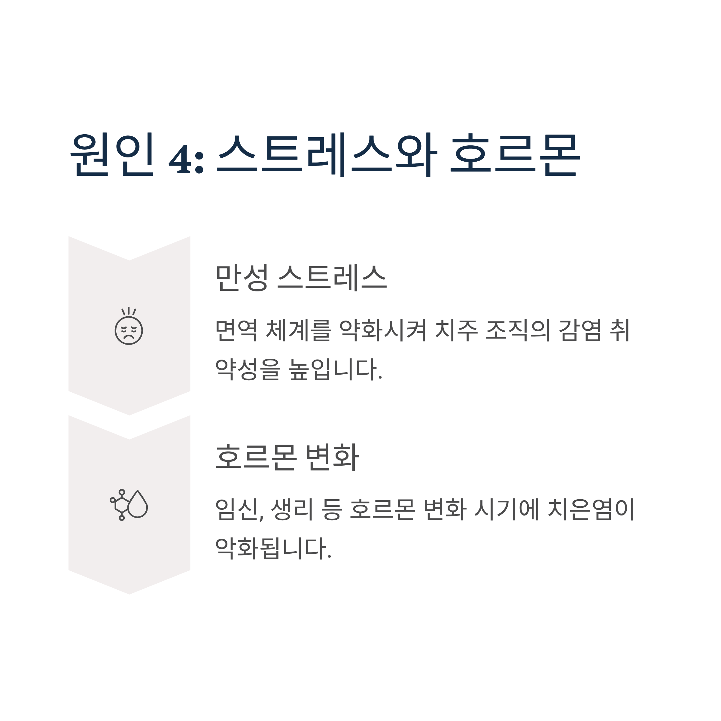 만성 스트레스는 면역 체계를 약화시켜 치주 조직의 감염 취약성을 높입니다. 임신, 생리 등 호르몬 변화 시기에도 치은염이 악화될 수 있습니다.