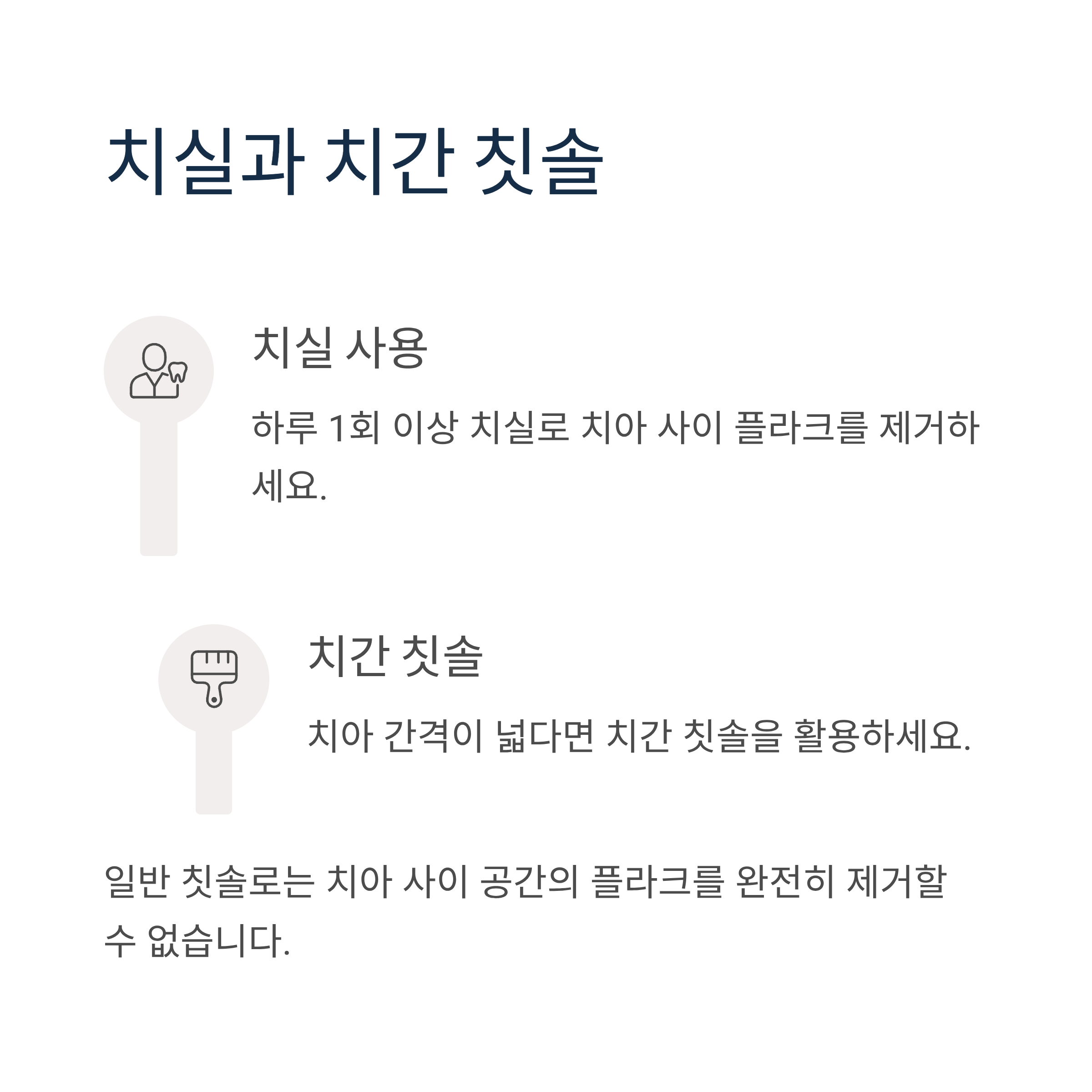 일반 칫솔로는 치아 사이 공간의 플라크를 완전히 제거할 수 없습니다. 하루 1회 이상 치실을 사용하고, 치아 간격이 넓다면 치간 칫솔을 활용하세요.
