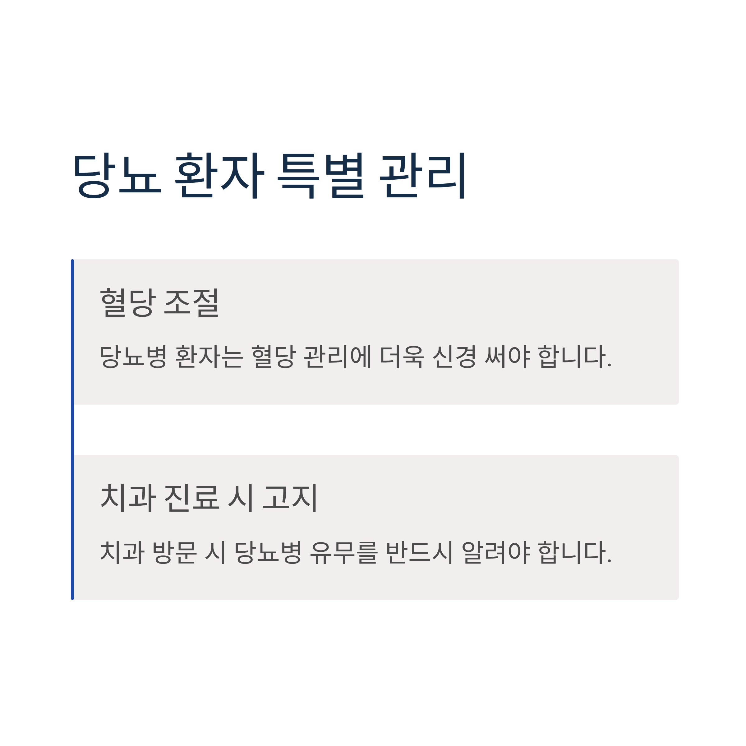 당뇨병 환자는 혈당 조절에 더욱 신경 쓰고, 치과 진료 시 당뇨병 유무를 반드시 알려야 합니다.