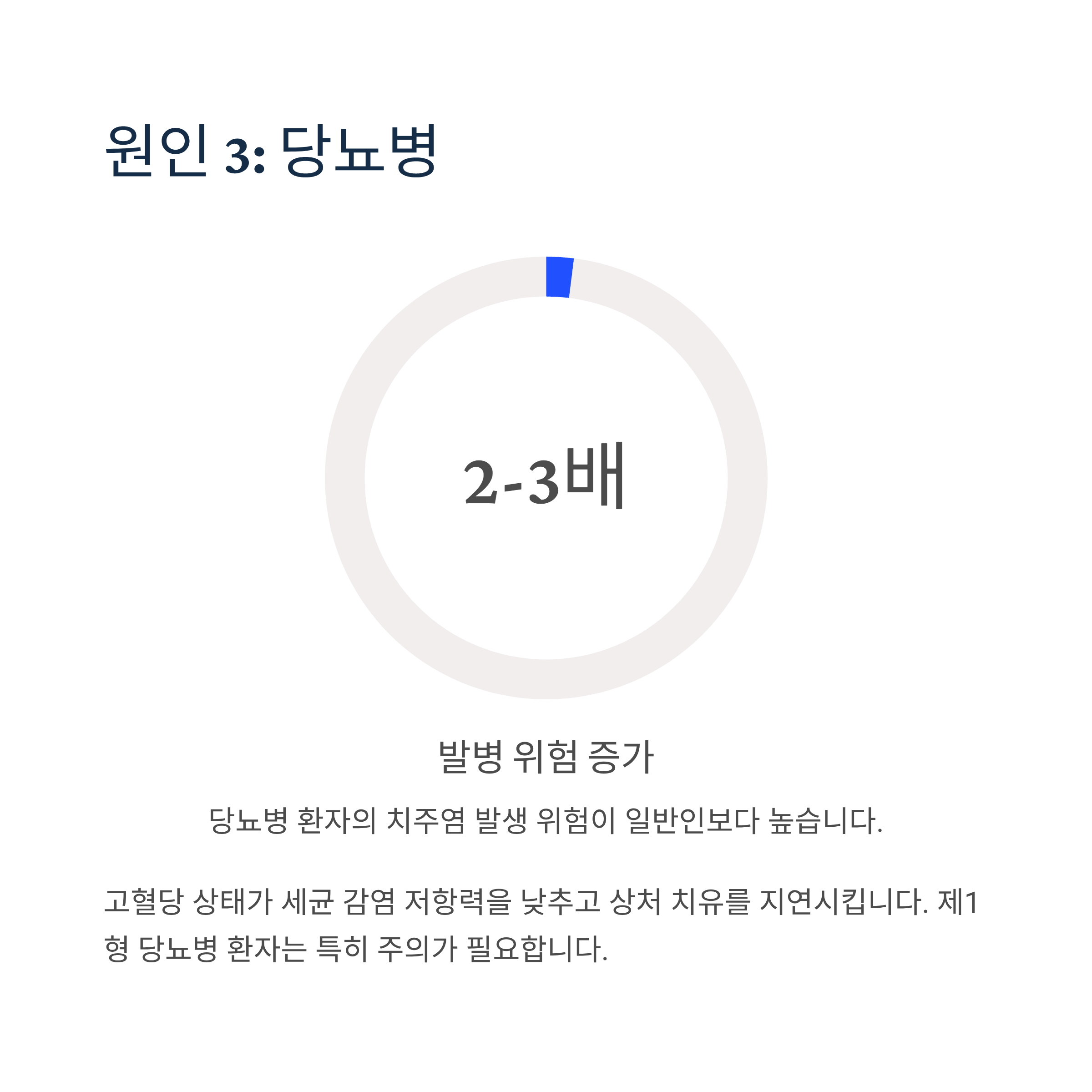 당뇨병 환자는 치주염 발생 위험이 일반인보다 2~3배 높습니다. 고혈당 상태가 세균 감염에 대한 저항력을 낮추고 상처 치유를 지연시키기 때문입니다. 특히 제1형 당뇨병 환자는 더욱 주의가 필요합니다.