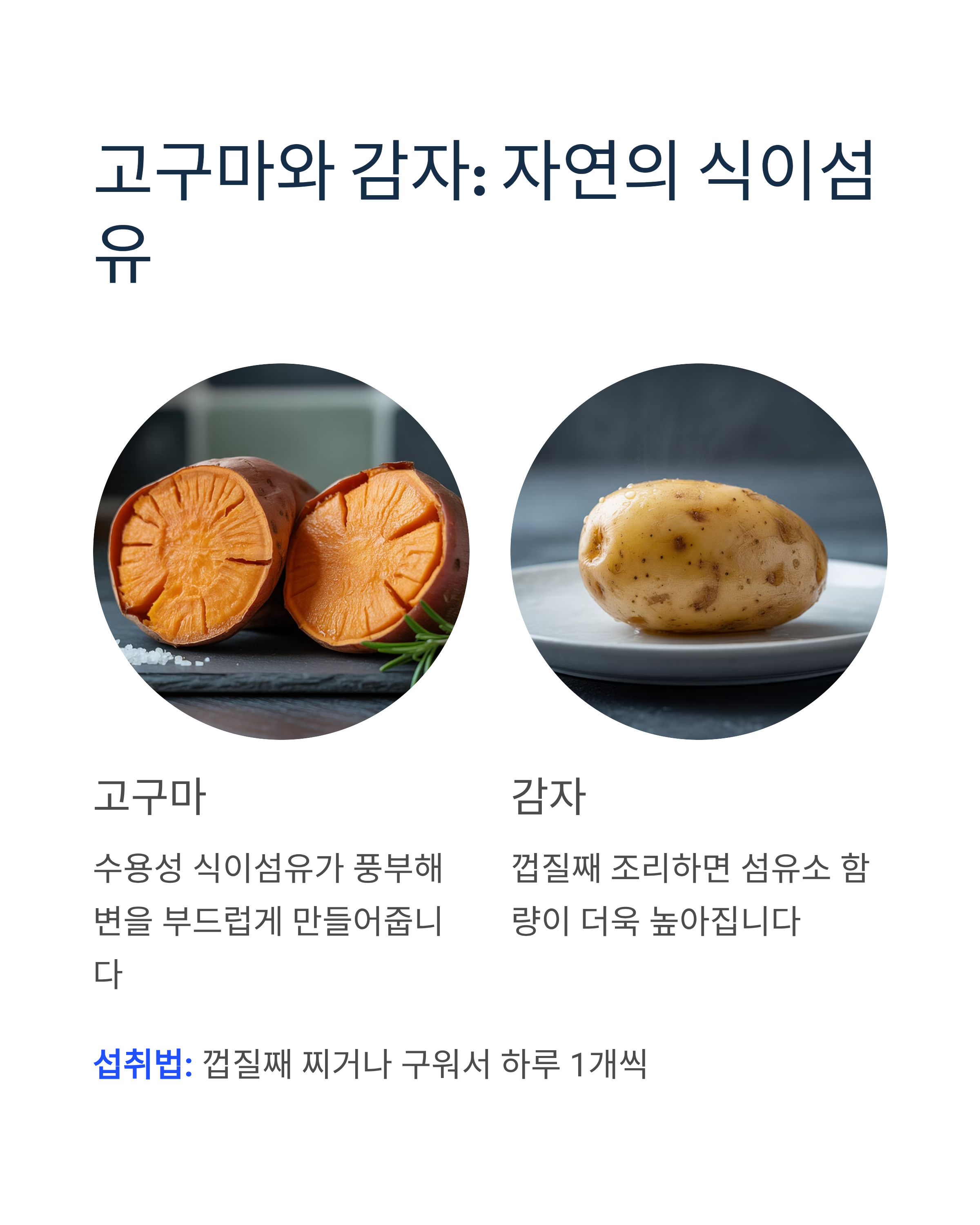 고구마, 감자에는 식물성 섬유소가 다량 함유되어 있으므로 일부러 챙겨 먹는 것이 좋습니다. 수용성 식이섬유가 풍부해 변을 부드럽게 만들어 배변을 원활하게 도와줍니다.