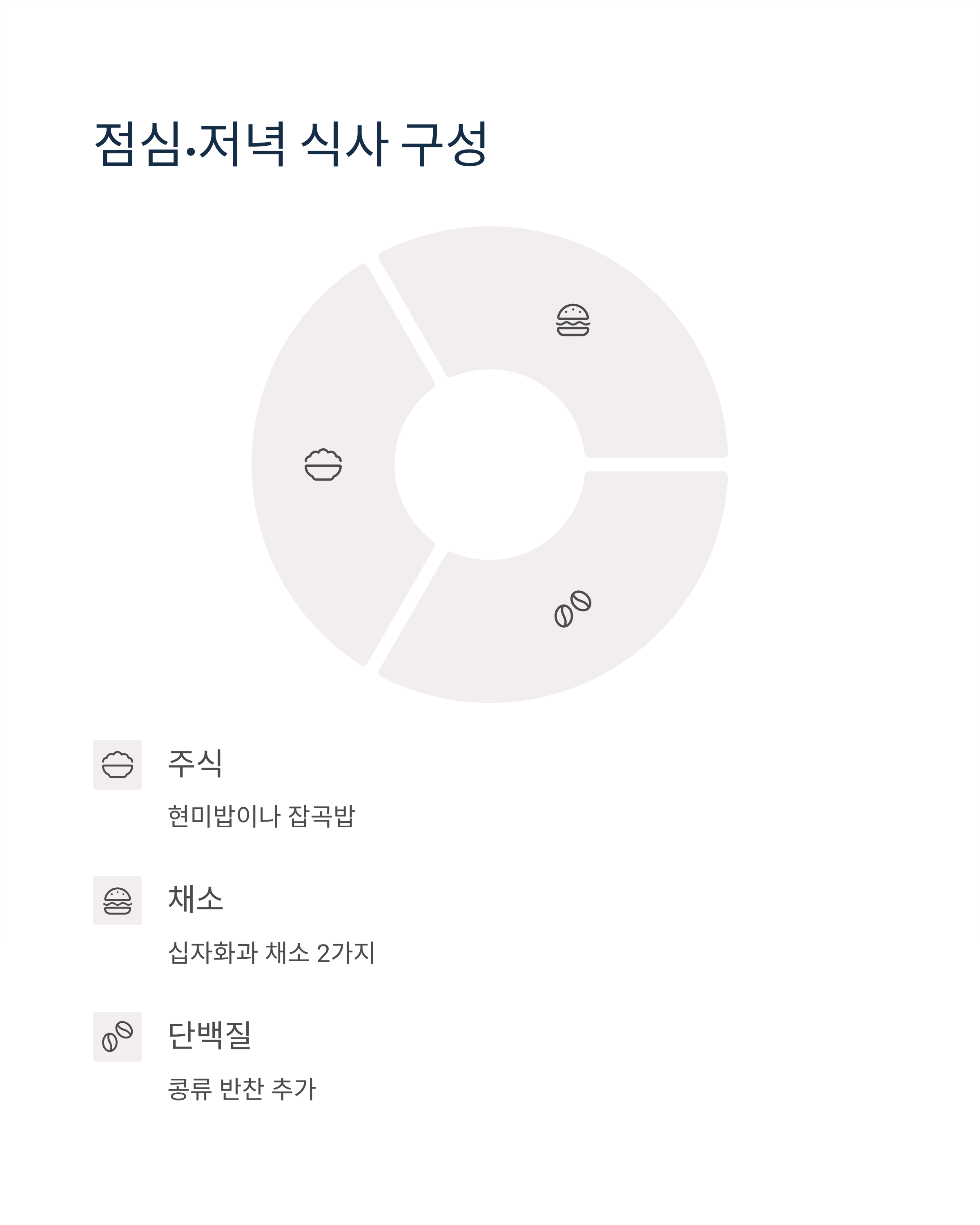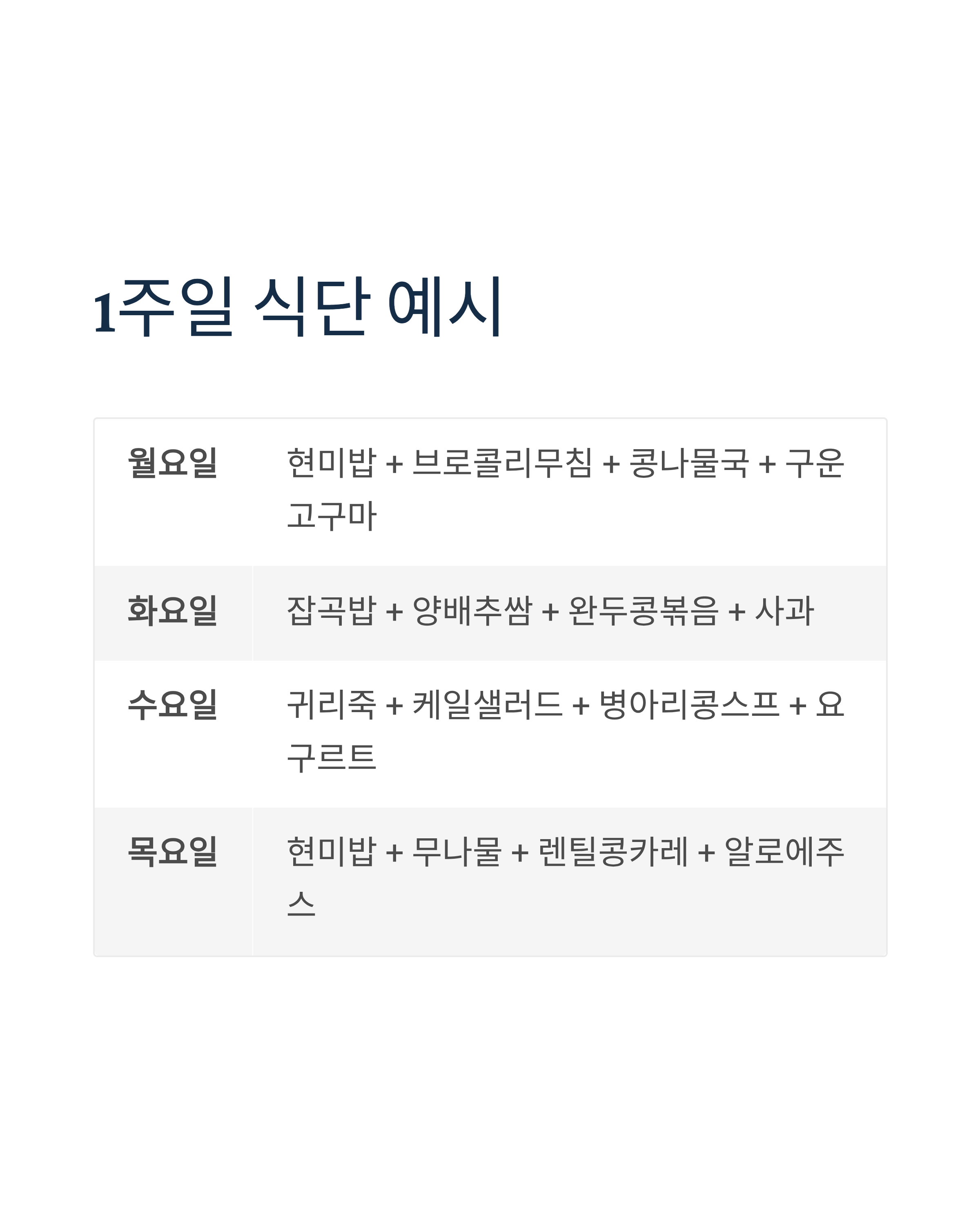 점심/저녁: 현미밥 + 십자화과 채소 2가지 + 콩류 반찬