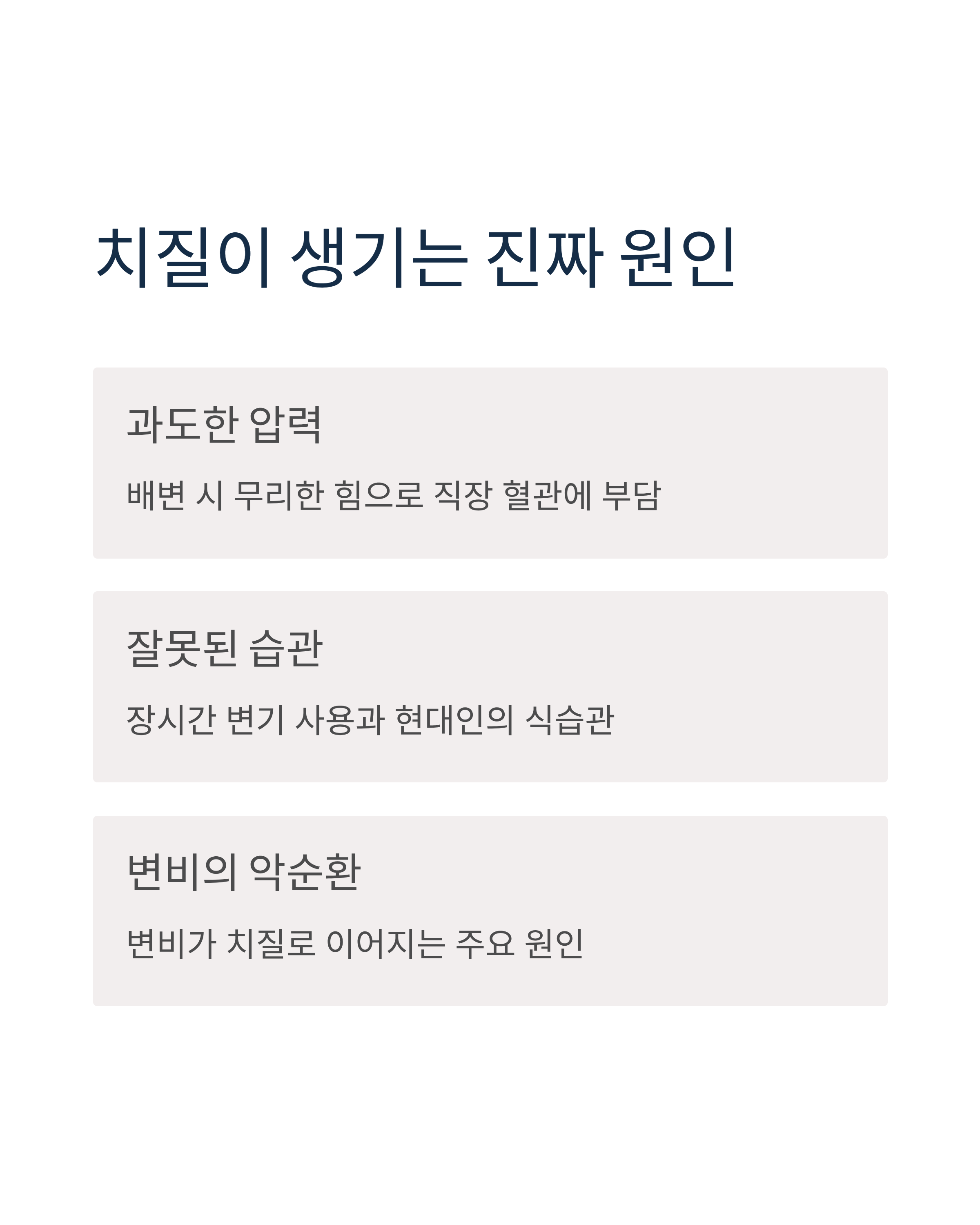 치질은 변비나 설사 등으로 배변 시 과도한 힘을 주거나, 장시간 변기에 앉아 있는 등 직장 내 혈관에 '압력과 긴장'이 증가하면서 출혈이나 탈항 등의 증상을 보이게 됩니다. 특히 현대인의 잘못된 식습관이 변비를 유발하고, 이것이 치질로 이어지는 주요 원인이 되고 있습니다.