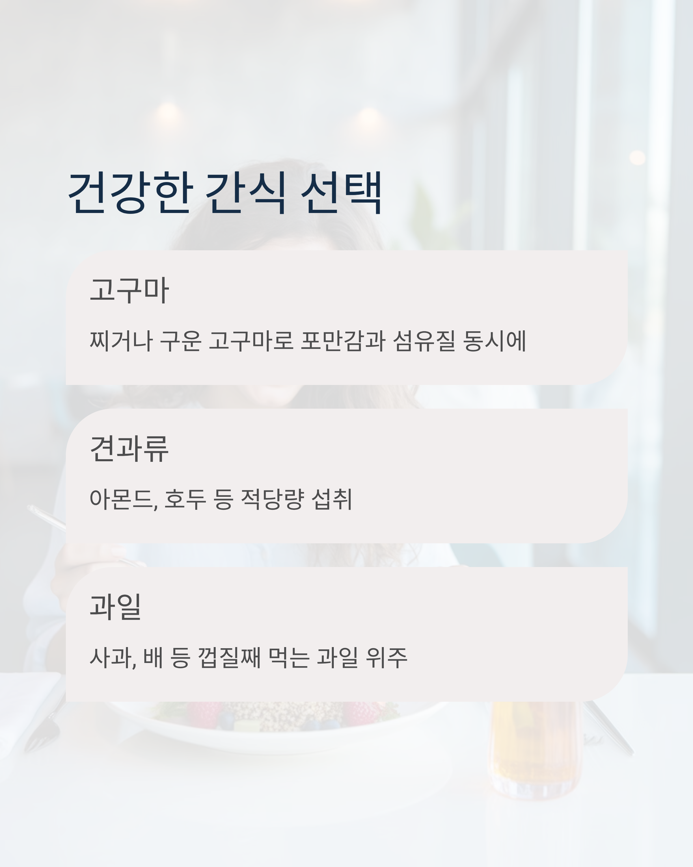 간식: 고구마나 견과류, 과일 위주로 선택