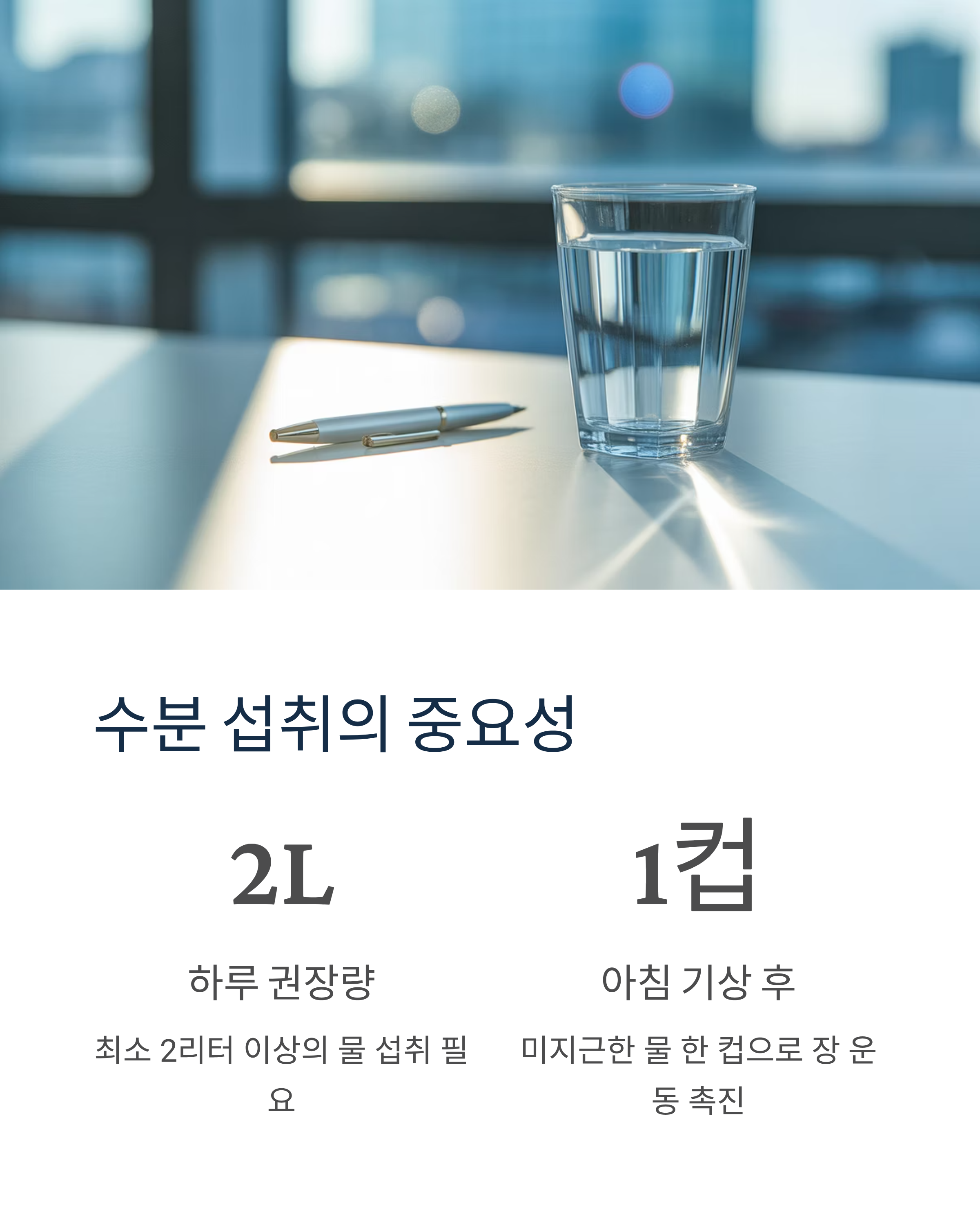 아침에 공복시 냉수 한잔은 배변을 원활하게 합니다. 하루 최소 2L 이상의 물을 마시며, 특히 아침 기상 직후 미지근한 물 한 컵이 효과적입니다.