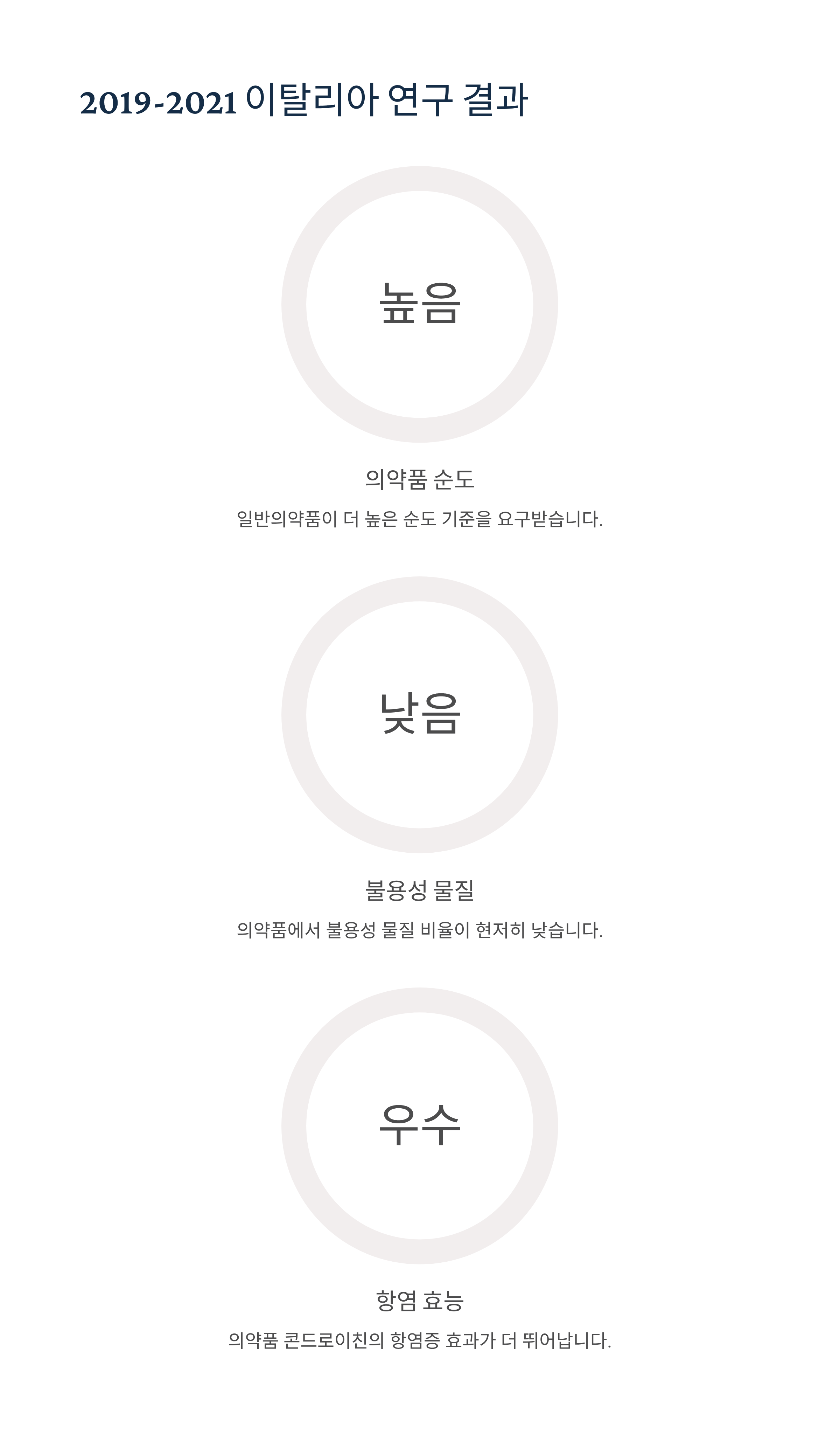 흥미롭게도 2019년과 2021년 이탈리아 연구진의 연구에 따르면, 일반의약품 콘드로이친이 건강기능식품 콘드로이친보다 불용성 물질의 비율이 낮고 항염증 효능이 더 큰 것으로 확인되었습니다. 이는 일반의약품이 건강기능식품보다 높은 순도 기준을 요구받기 때문으로 분석됩니다.