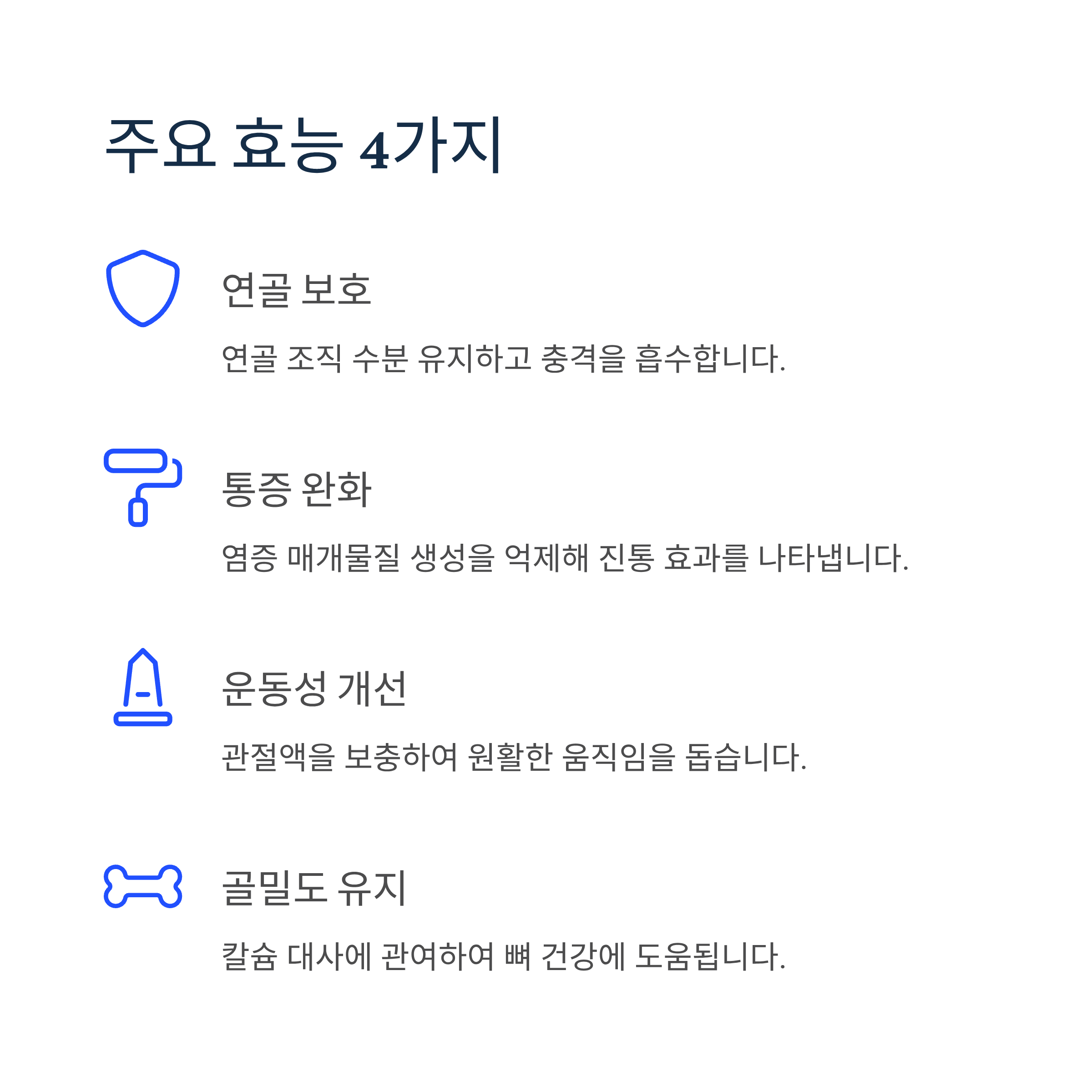 연골의 쿠션 역할을 하며 마모를 방지하는 기능이 있어 퇴행성 관절염(골관절염) 예방에 도움이 됩니다. 또한 염증 매개물질 생성을 억제하는 작용을 통해 진통 효과를 나타낸다고 보고되고 있습니다.