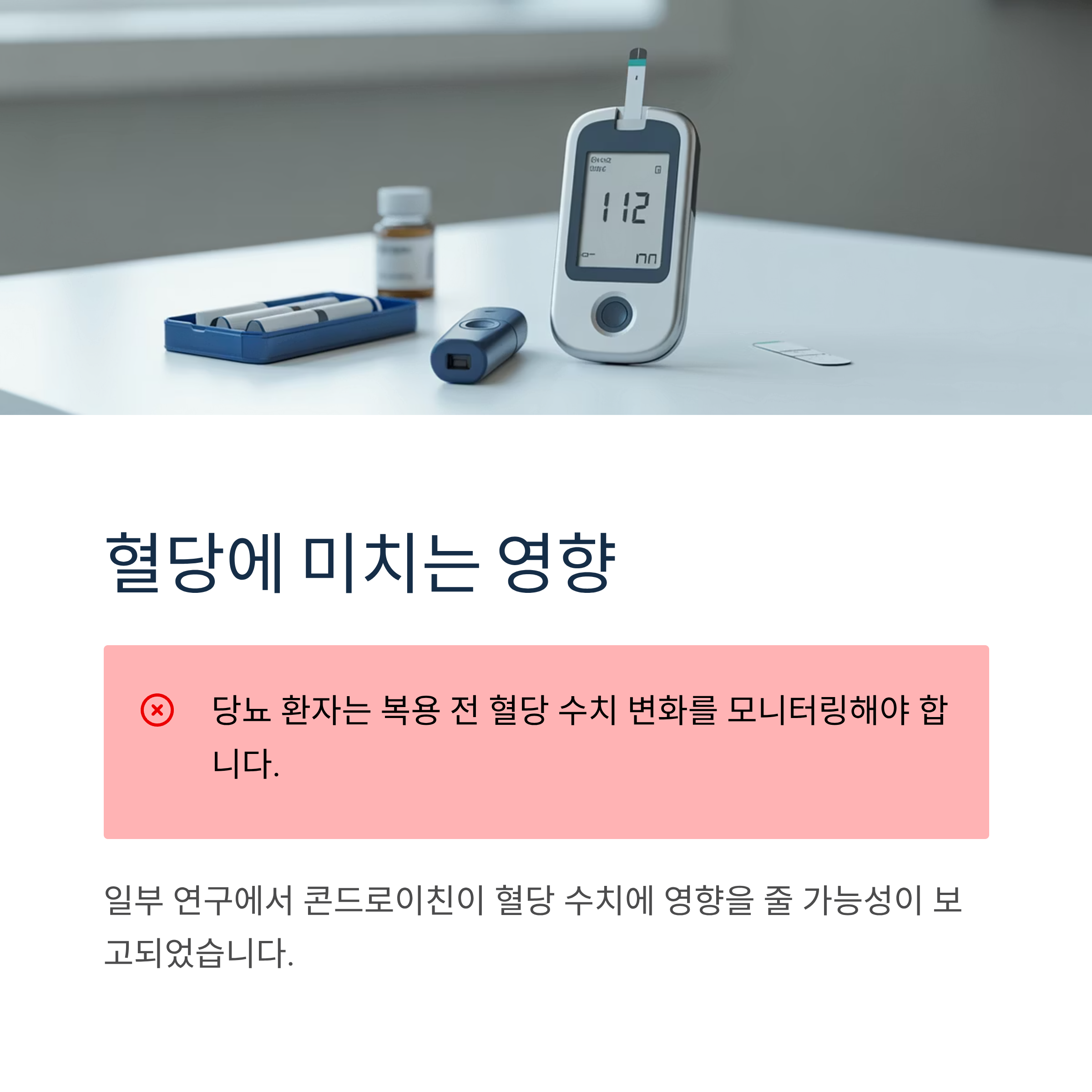 일부 연구에서는 콘드로이친이 혈당 수치에 영향을 줄 가능성이 있다고 보고되었습니다. 당뇨 환자는 복용 전에 혈당 수치 변화를 모니터링하는 것이 필요합니다.