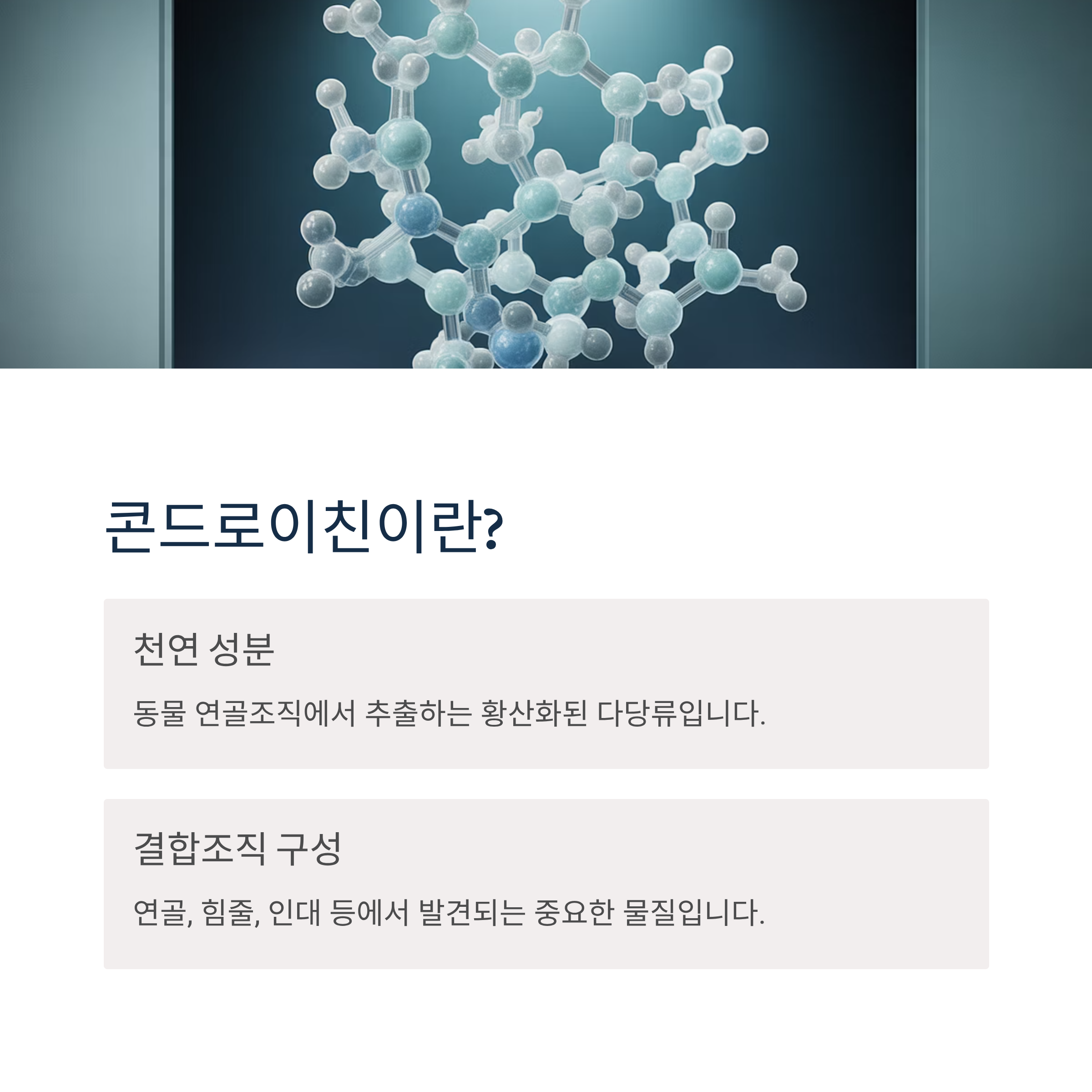 콘드로이친은 관절 건강을 위한 보조 성분으로서 오랜 기간 연구되고 사용되어 왔습니다. 비록 효능에 대한 논쟁이 있지만, 우리 관절에 이미 함유되어 있는 성분이기 때문에 부작용이 적고 중장년층의 삶의 질 향상에 도움이 될 수 있습니다.